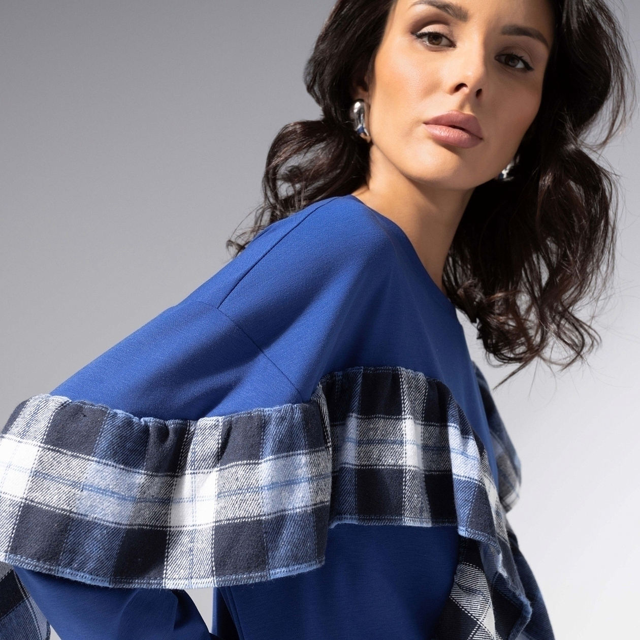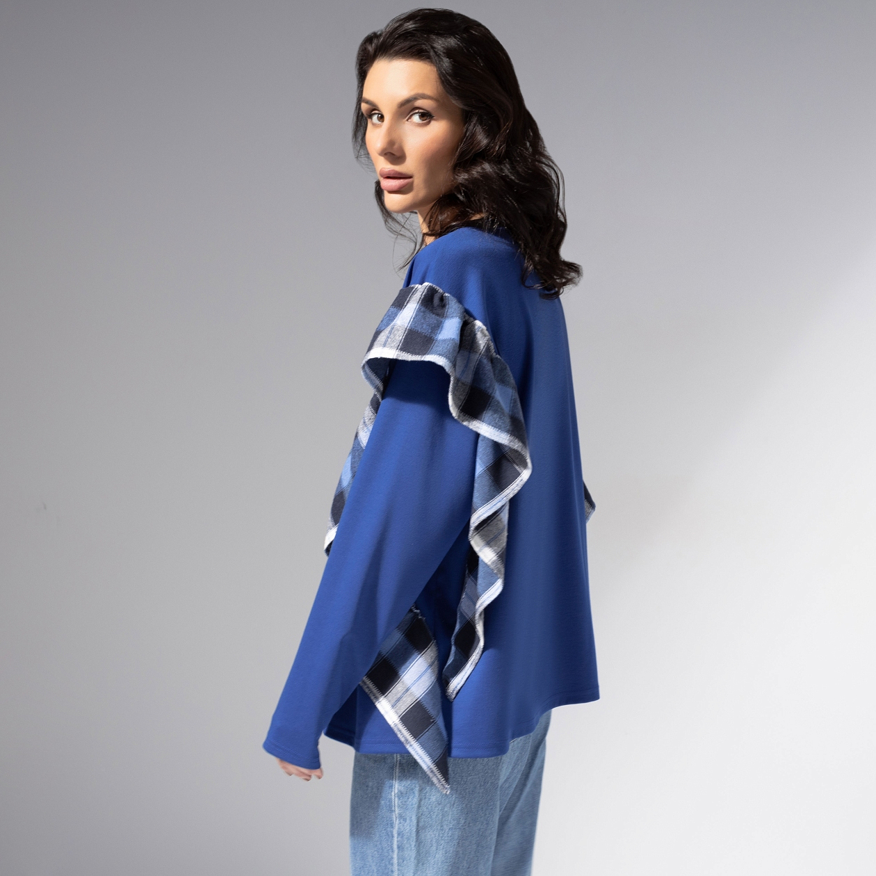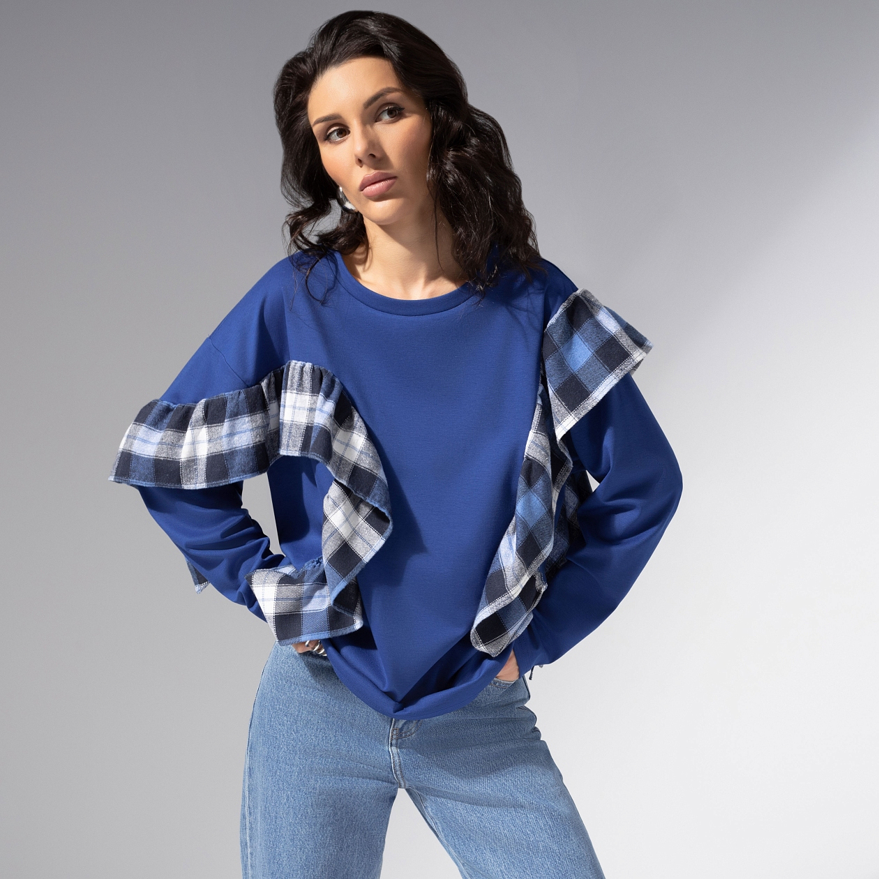 Трикотаж антипилинг. Вставки из клетчатой фланели формируют воланы по переду и рукавам. Свободный силуэт, круглый вырез, комфортная длина. Приятен к телу, сохраняет насыщенность цвета после стирок.