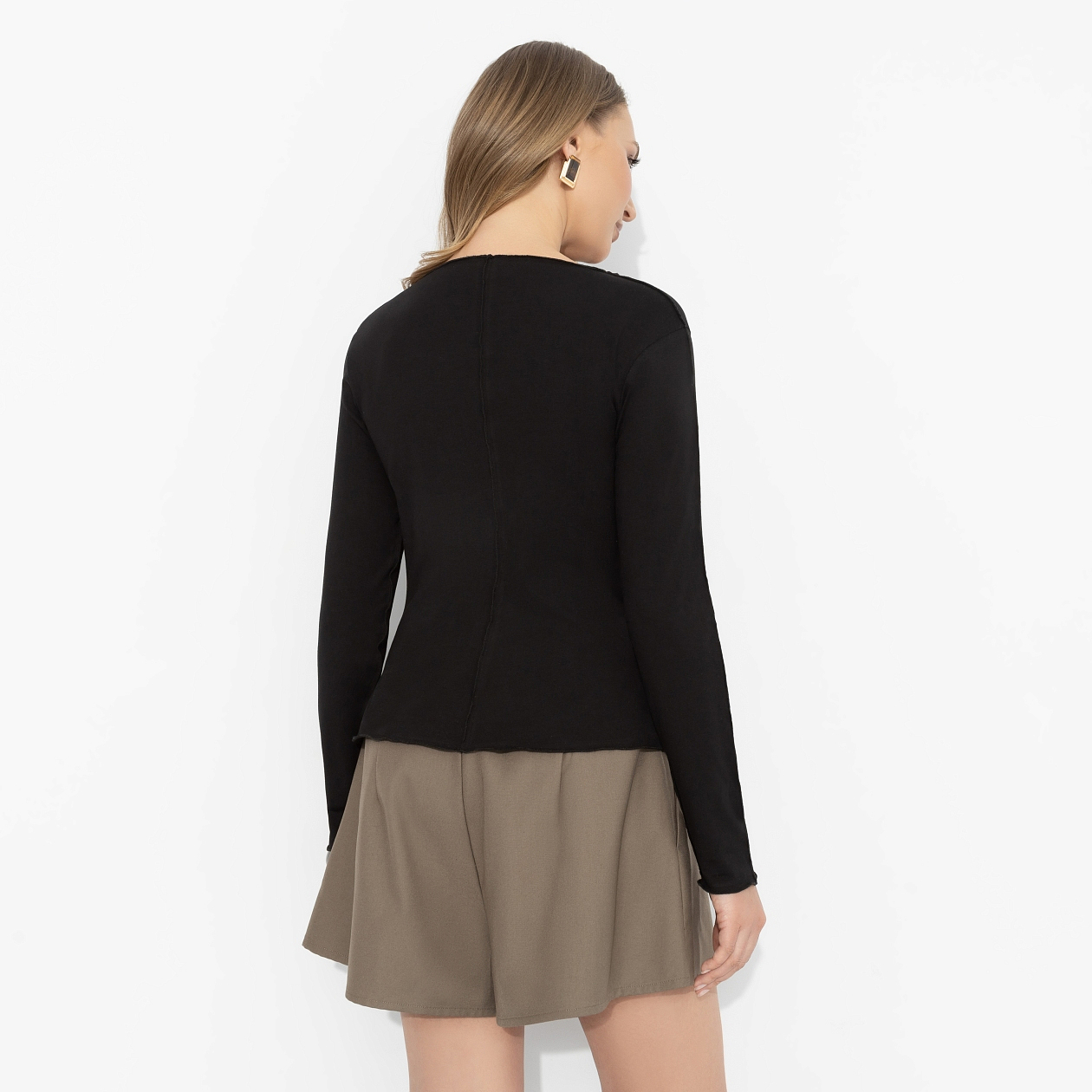 Бывют вещи, наличие которых в шкафу не обсуждается. Как белая рубашка, как идеальные джинсы − ты просто знаешь: они нужны. Ноый лонг от ЧАРУТТИ − тот самый уровень базы, когда не «на всякий случай», а «без него вообще никак». Надела − и уже всё собрано, даже если остальной образ ещё в процессе. Чёрный лонгслив из мягкого кулира комфортно садится по фигуре. Чистый крой с акцентными швами и универсальный оттенок «оникс» усиливает любой образ и работает круглый год.