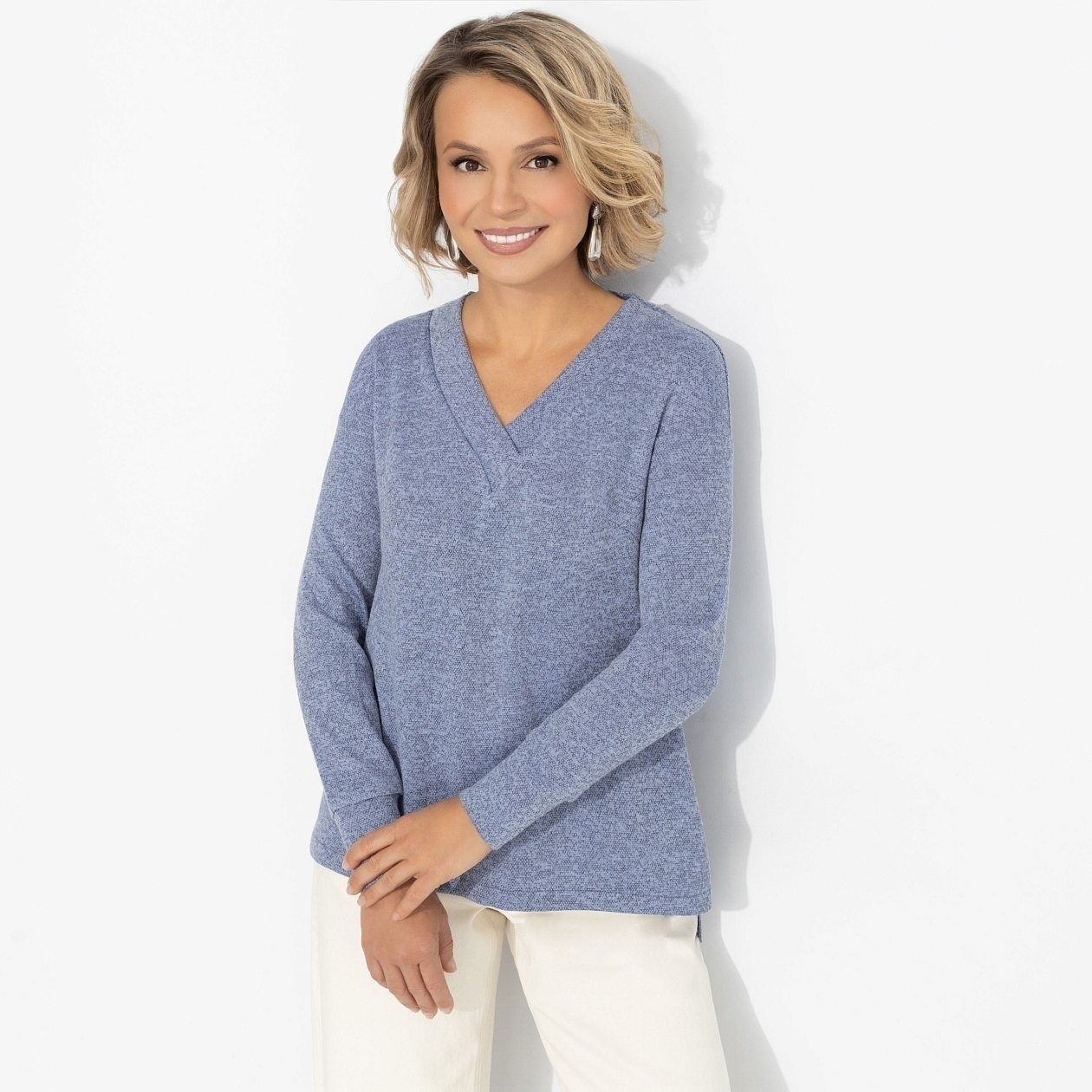 Свободный свитер с V-образной горловиной из меланжевой пряжи не сковывает движения и легко сочетается с базовым гардеробом. Идеально подходит обладательницам голубых, серых, зелёных глаз.
