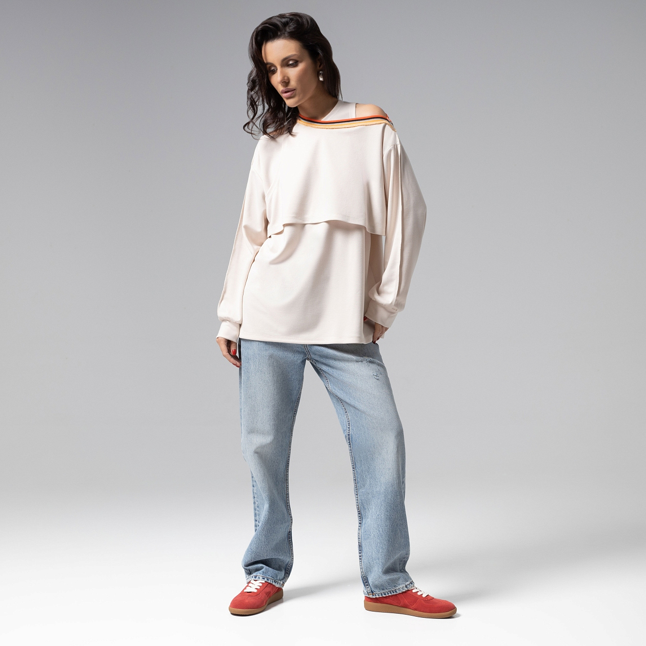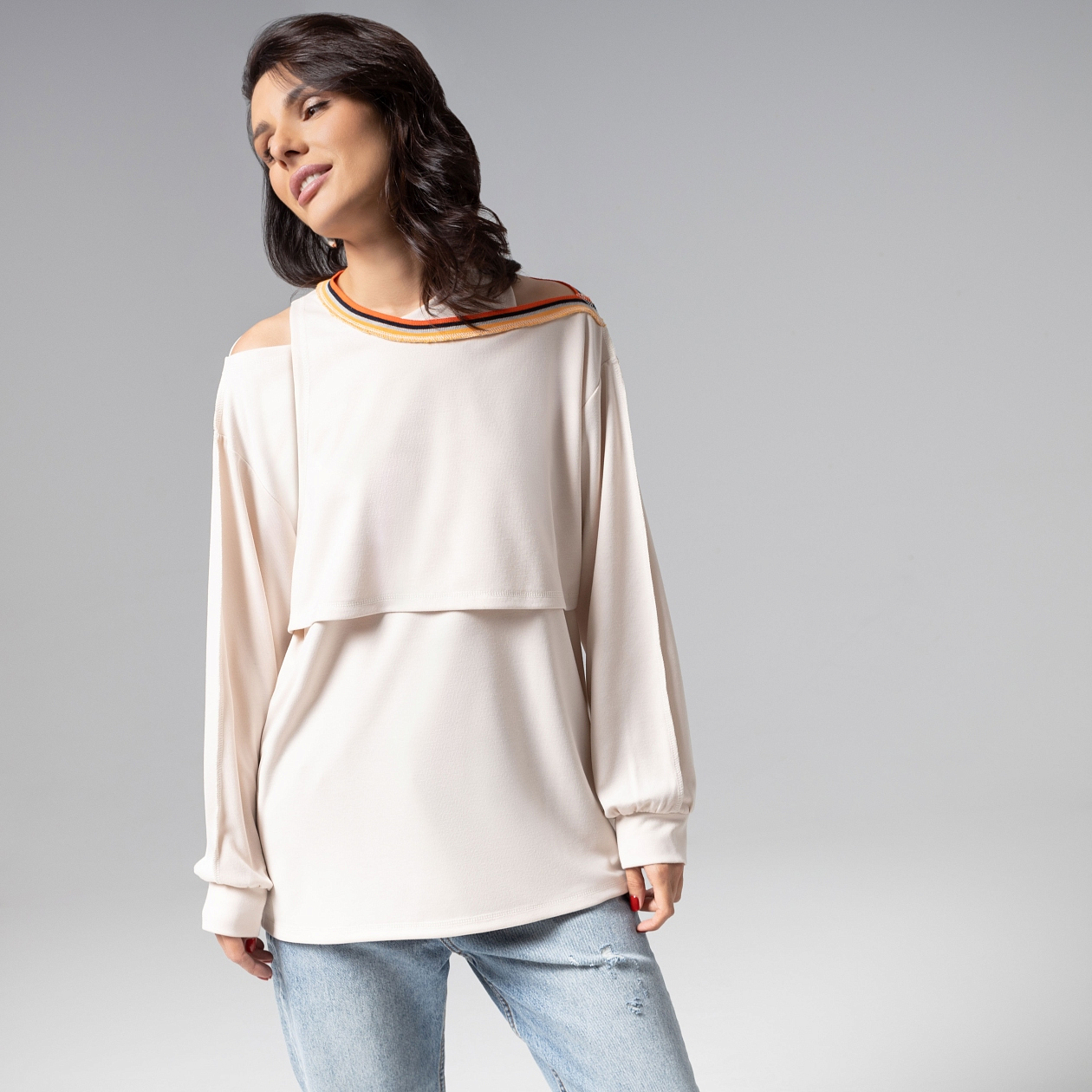 Лонгслив ЧАРУТТИ как игра контрастов. Нежный молочный оттенок сочетается с резинкой контрастных цветов, создавая эффект мягкого свечения вокруг силуэта. Асимметричная многослойность превращает базовую модель в концептуальный объект. Каждый шов изделия – пример безупречной работы. Изделие 2 в 1. Каждый элемент можно носить и стилизовать по-отдельности.