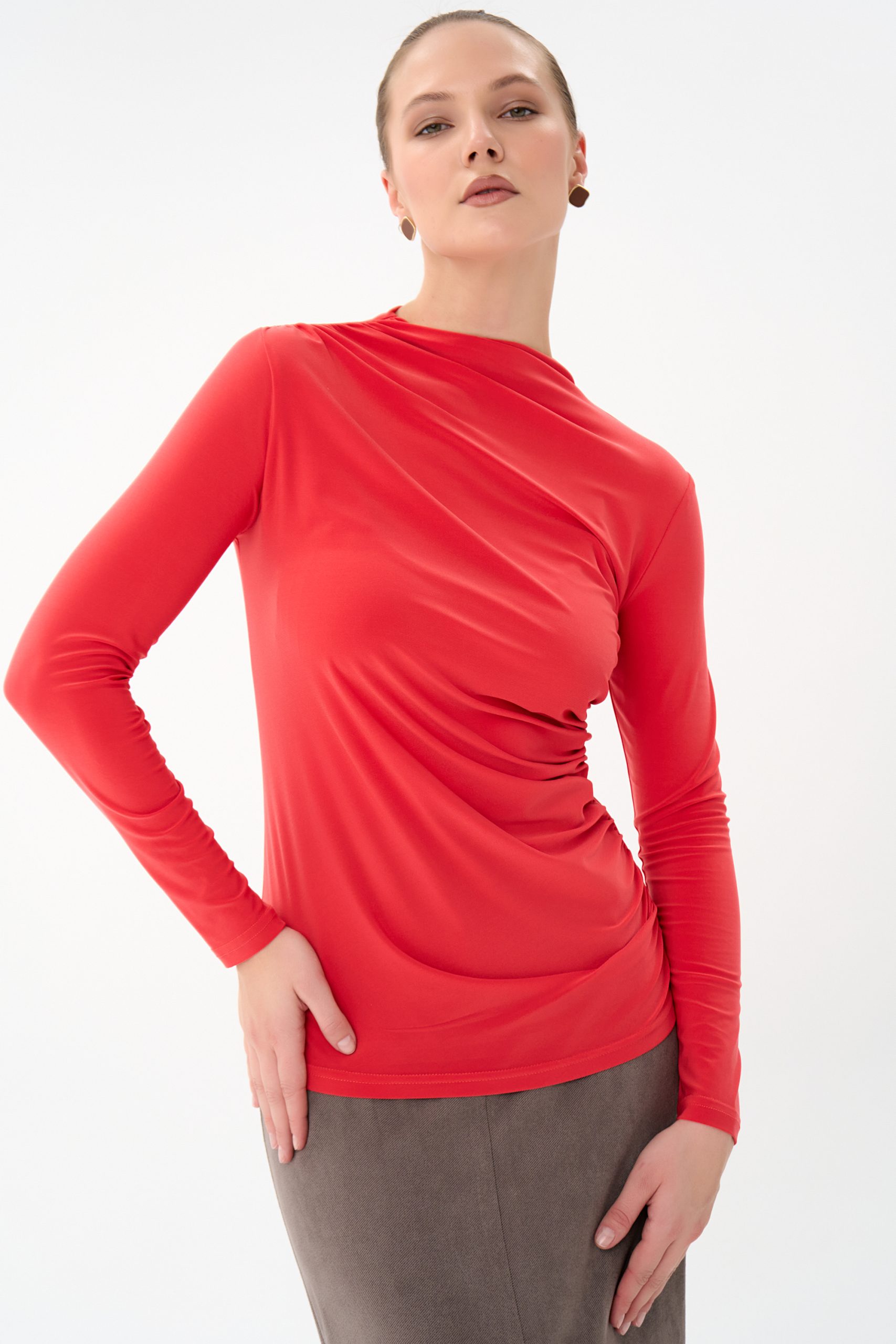 Этот лонгслив станет универсальной базой в гардеробе, добавляя образам женственность и аккуратный акцент за счёт выразительной драпировки и насыщенного цвета