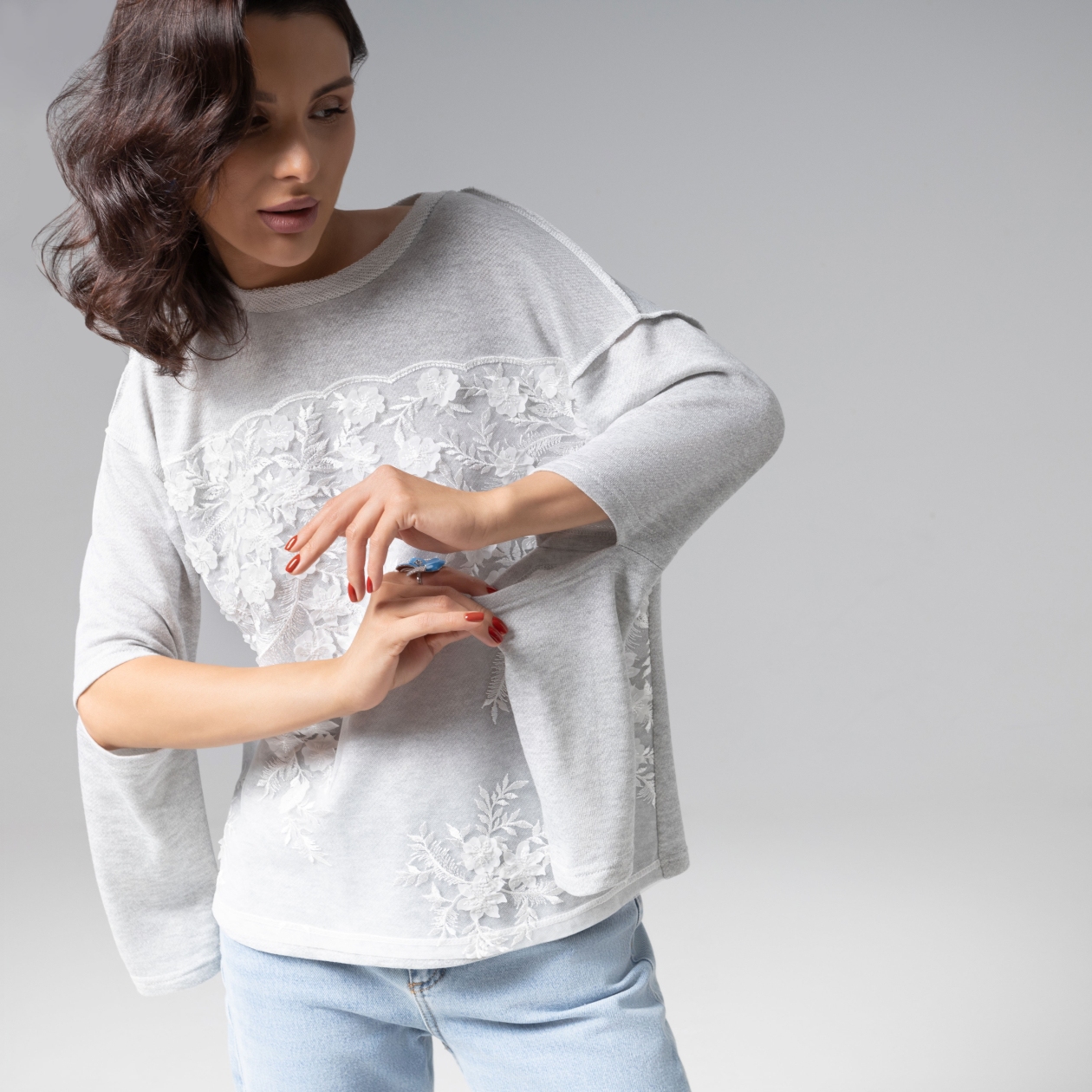 Состав: Трикотаж «футер», вышивка на сетке (50% хлопок, 45% п/э, 5% спандекс)