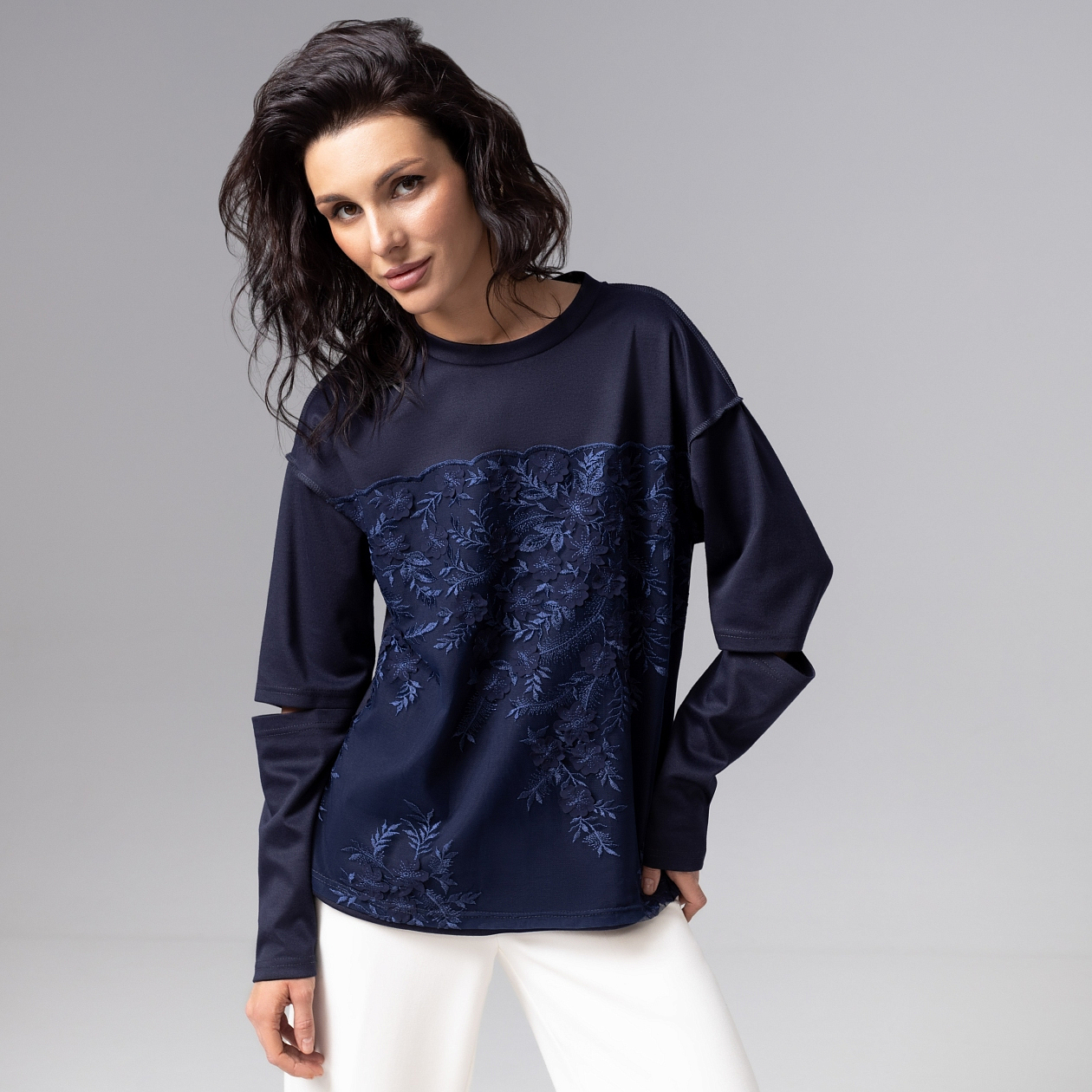 Лонгслив ЧАРУТТИ в дорогом глубоком синем цвете представляет собой баланс стиля casual и haute couture. Свободная посадка подходит любому типу фигуры. Изящное кружевное дополнение по передней стороне изделия придает изделию элегантный вид, а трендовые прорези на рукавах подчеркивают ваше внимание к деталям. Безупречный пошив демонстрируют идеальные строчки и тщательная проработка швов, что гарантирует долговечность носки.