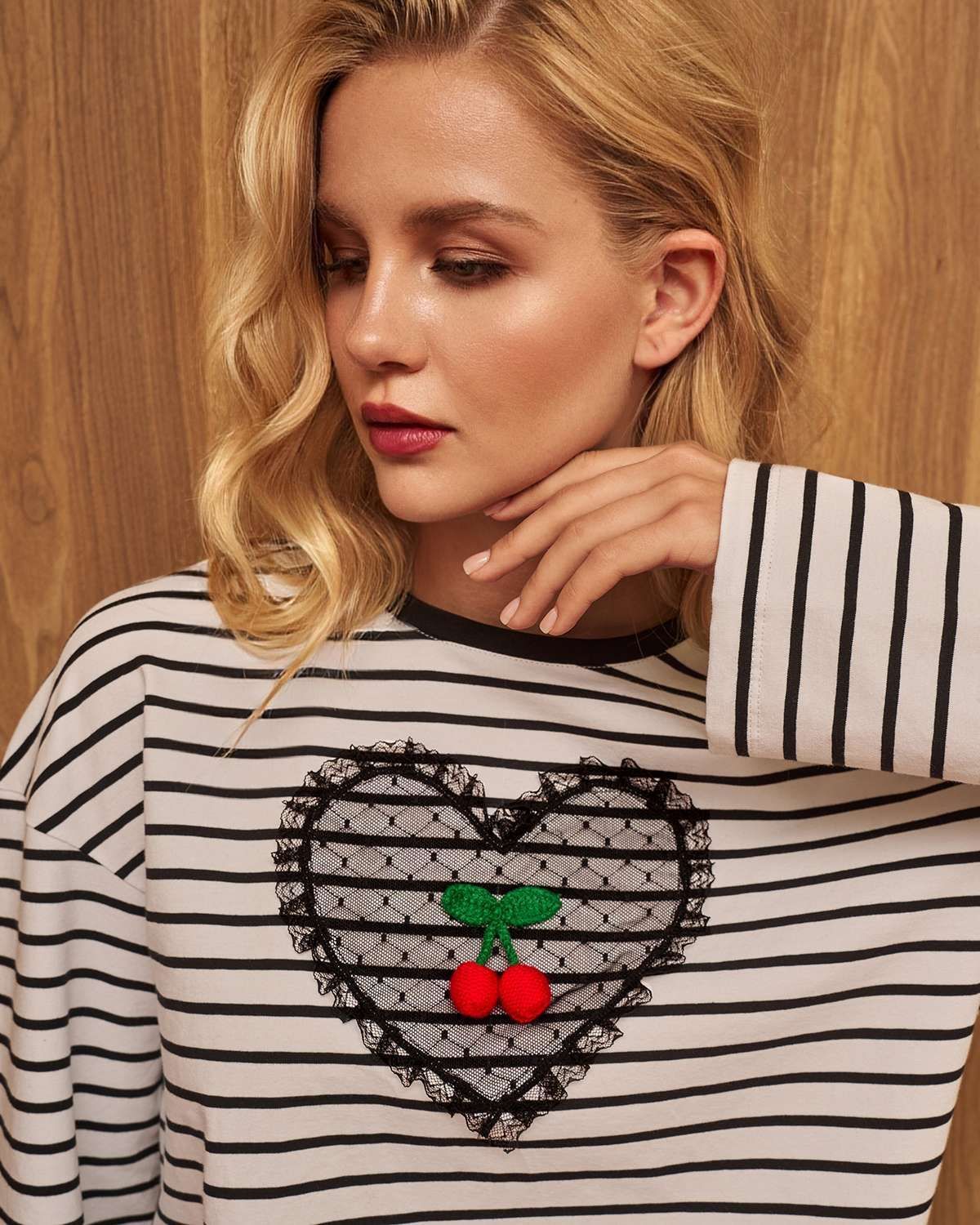 Белый хлопковый лонгслив в черную полоску станет стильным дополнением вашего гардероба. Аппликация впереди в виде кружевного черного сердца с оригинальными деталями в виде вязаных вишенок придает изделию игривость и нежность. Широкие рукава обеспечивают комфорт и свободу движений, а слегка спущенная линия плеча подчеркивает расслабленный силуэт. Свободный крой позволяет чувствовать себя уверенно и стильно в любых ситуациях. Этот лонгслив прекрасно сочетается как с джинсами, так и с юбками, создавая гармоничные и привлекательные образы. 95% хлопок, 5% лайкра