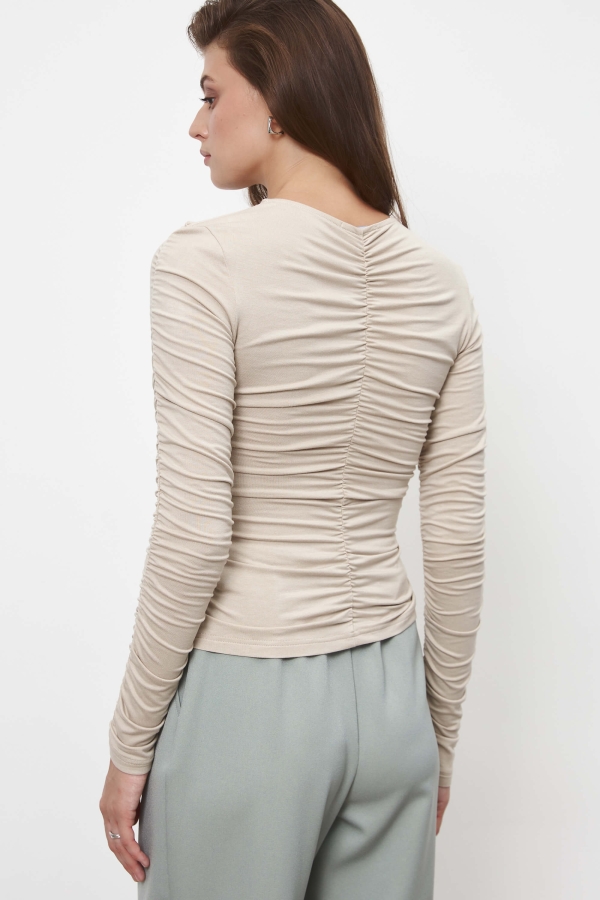 Стильный лонгслив из мягкого вискозного трикотажа. Модель прилегающего силуэта. Втачной рукав. По переду, спинке и рукаву выполнена сборка.