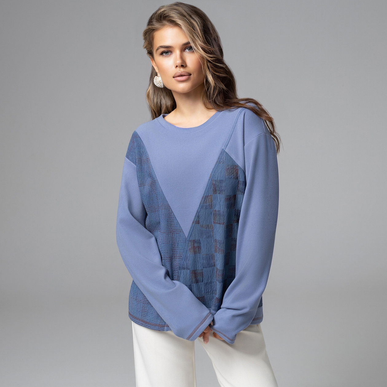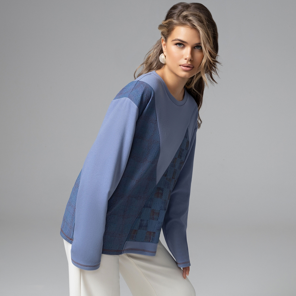 Жизнь редко движется по прямой. Иногда всё решают неожиданные повороты – в судьбе, в планах, в стиле. Диагонали, пересечения фактур и ощущение движения в твоем новом свитшоте делают образ живым. Контраст трикотажа «фланель» и фактурного «крэш» усиливает архитектуру диагонального кроя. Твой образ смотрится интеллектульным и дизайнерским. Впрочем, так и есть.