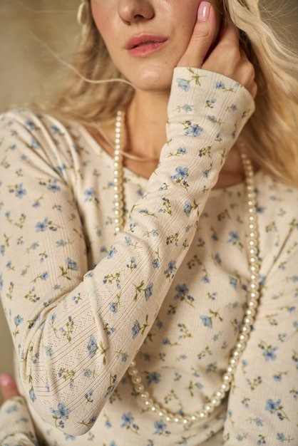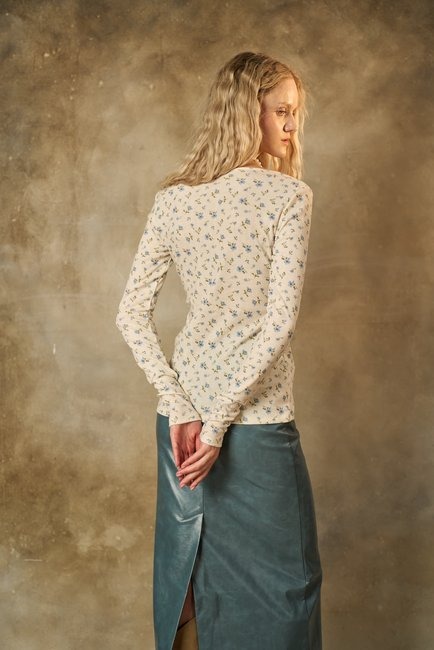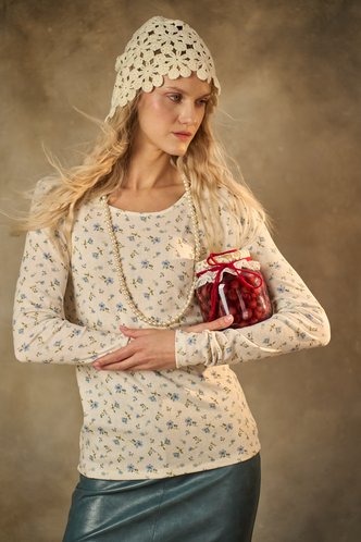 Лонгслив молочного цвета. Облегающая модель из мягкого и приятного трикотажа подчеркивает женственность и нежность образа. Мелкий голубой цветочек придает изделию свежесть и легкость, делая его идеальным выбором для повседневного стиля.