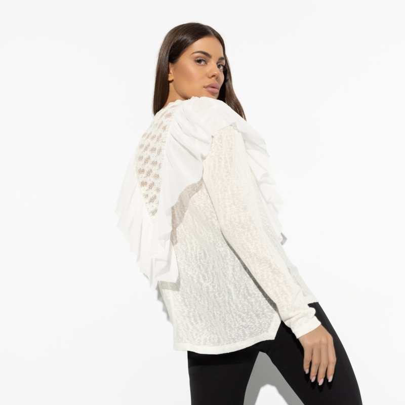 Сто комплиментов помножим на три предложения о встрече. Такова арифметика уникального лонгслива CHARUTTI. Посчитать выгоду от обладания изделием сможет даже отъявленный гуманитарий. Сложите прозрачность, рюши и кружево, чтобы получить правильный стильный ответ. Лонгслив свободного кроя. Рукав чуть удлинен. Изделие с двух сторон украшено рюшами. Лонгслив слегка прозрачный.