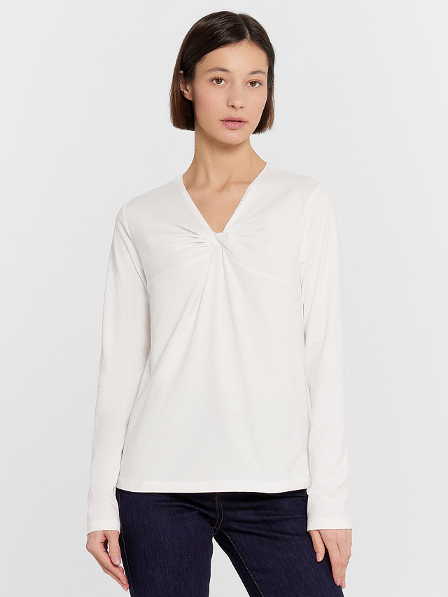 Этот изящный лонгслив прекрасно дополнит ваш гардероб. Он изготовлен из нежной кулирки, что обеспечивает мягкость, эластичность и комфорт при носке. Натуральный материал позволяет коже дышать, не вызывая раздражений, и сохраняет свою форму даже после многократных стирок. Модель имеет прямой силуэт и V-образную горловину с деталью в виде перекрута, добавляющую уникальности. Длинные рукава придают образу элегантность и утонченность. Женский лонгслив от Mark Formelle станет отличным выбором для создания стильных и изысканных образов на каждый день.