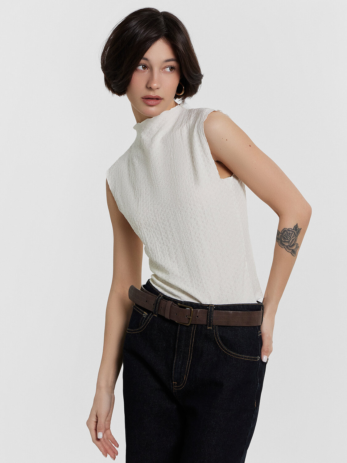 Этот женский топ — элегантное сочетание комфорта и стильного дизайна. Прилегающий силуэт подчеркивает фигуру, создавая изящный и женственный образ. Горловина со стойкой добавляет модели выразительности и делает её идеальной для стильных сочетаний — будь то классические брюки, юбка или джинсы. Топ выполнен из фактурного материала с эластичными искусственными волокнами, что обеспечивает комфортную посадку, свободу движений и легкость в носке. Ткань приятно прилегает к коже, хорошо держит форму и создает современный, аккуратный вид. Эта модель станет отличным дополнением к гардеробу, легко комбинируя с повседневными и вечерними луками. Идеальный вариант для тех, кто ценит стиль, удобство и качественные материалы!