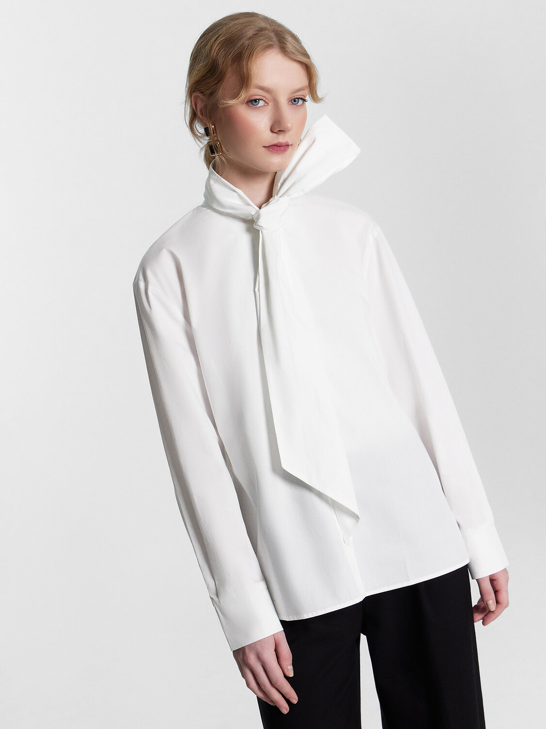 Блузка прямая, свободная. Горловина круглой формы с воротником-бантом. Рукава втачные длинные с отрезными манжетами. По низу рукава заложены складки. По переду обработана центральная застежка на петли и пуговицы (на 4 прокола D10мм). По спинке отрезная кокетка. На нижней части спинки по центру заложены складки. Нижний срез блузки обработан швом вподгибку с закрытым срезом.