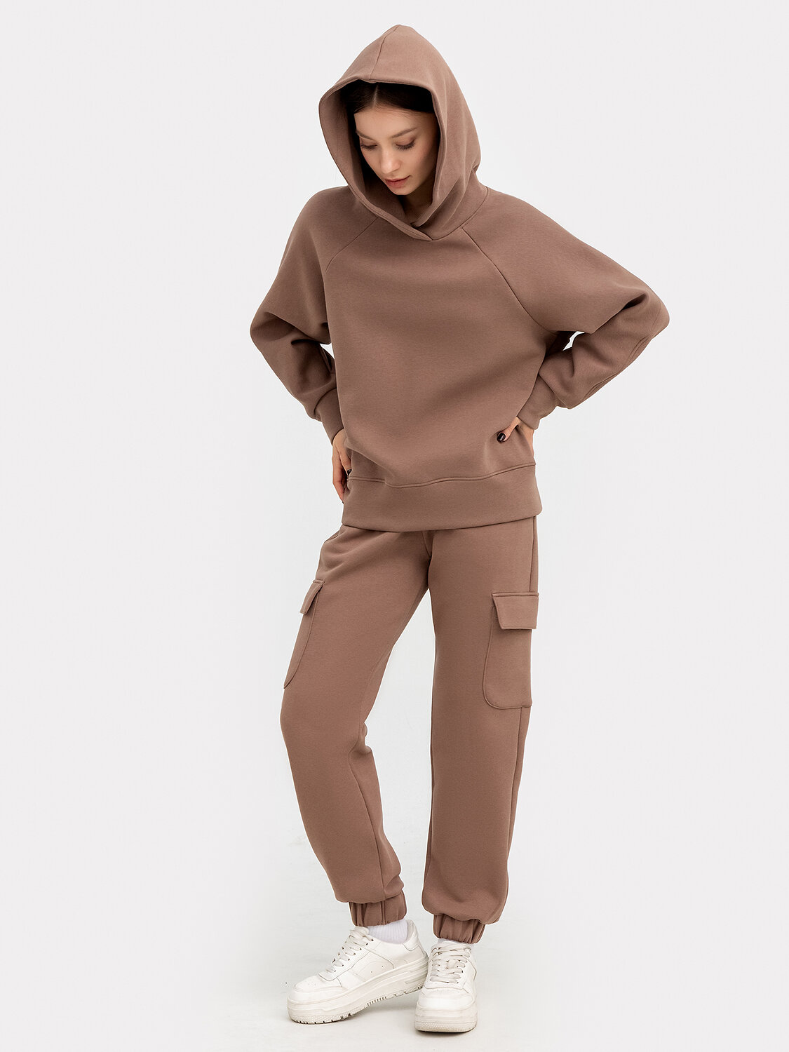 Женские брюки карго из трикотажного футера с теплым и нежным подчесом. Силуэт свободный. Есть не только боковые карманы, но и накладные карманы с клапаном. Пояс с эластичной тесьмой внутри. Брюки завершаются манжетой с эластичной тесьмой внутри. Стильные брюки для модных городских образов!
