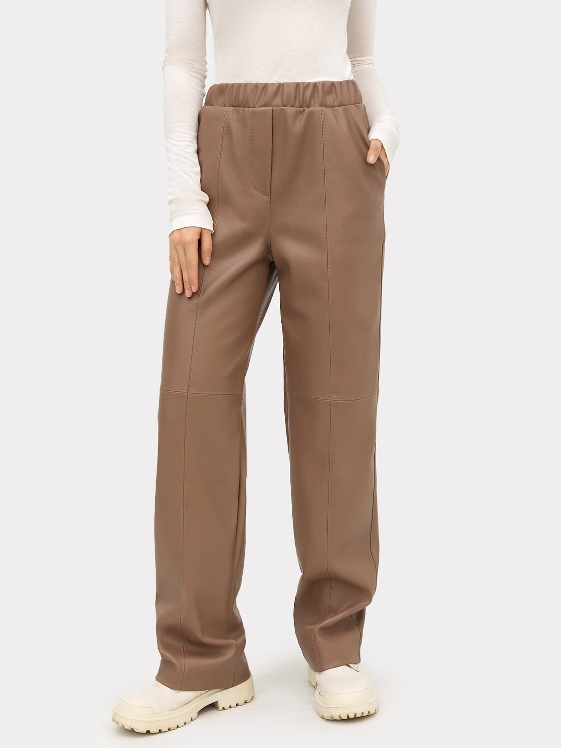 Женские брюки прямого свободного силуэта из экокожи. Пояс с эластичной тесьмой внутри, линия талии чуть завышена. Есть боковые карманы. На передней части модели – имитация гульфика, а также горизонтальные и вертикальные рельефные швы. Эти брюки вы искали!