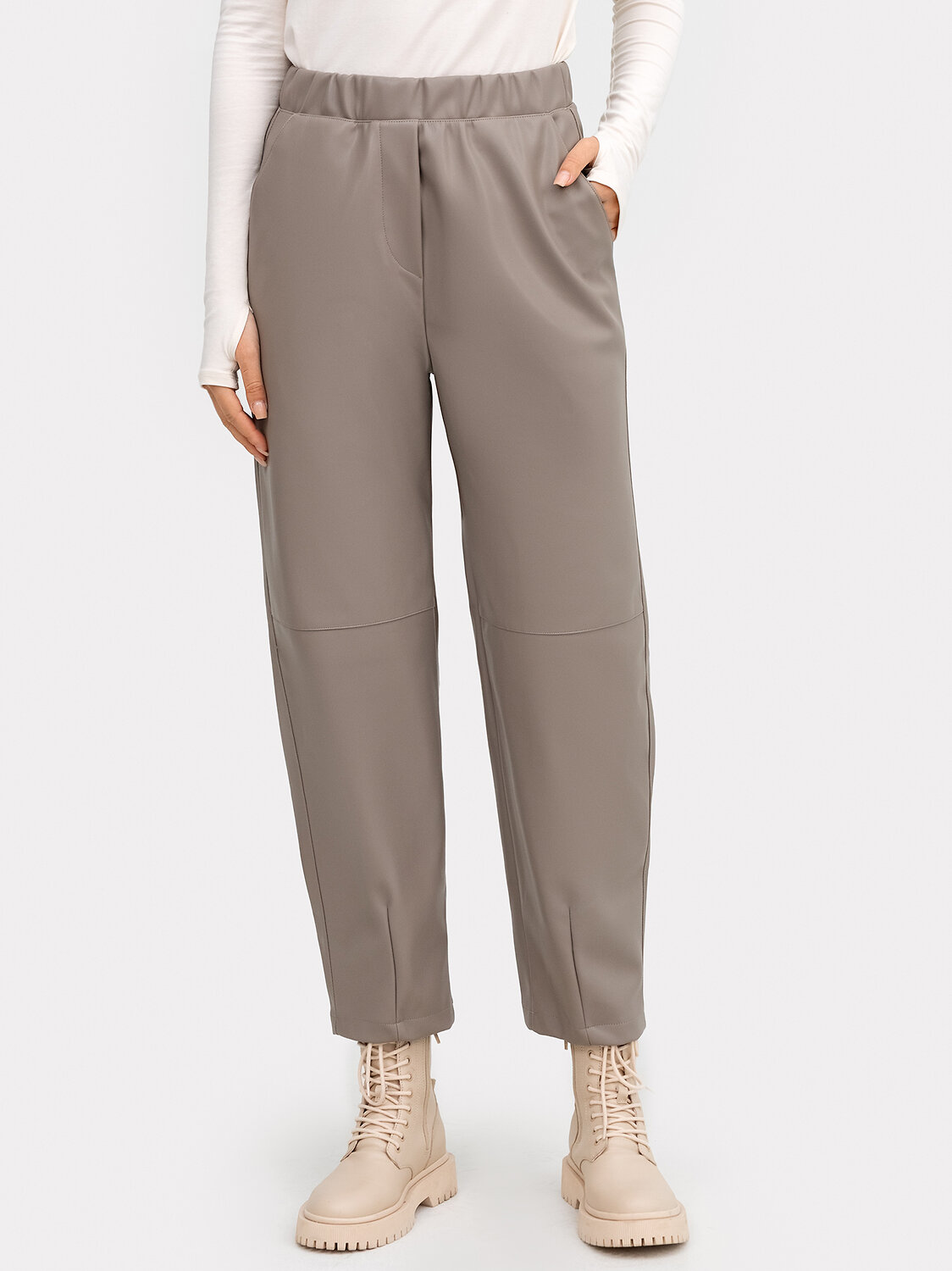 Модные брюки женские бананы из высококачественного материала - экокожа. Пояс отрезной из основного полотна, передняя часть пояса гладкая, задняя часть с эластичной тесьмой внутри. В брюках карманы с отрезным бочком. На передних деталях горизонтальные членения и вытачки по низу. Комфортный мягкий материал хорошо ведет себя в носке, слегка тянется, не стесняет движений. Такие брюки женские отлично подходят для осенне-зимнего периода. Вариант брюк, который можно сочетать с массой других вещей из вашего гардероба за счет облегающего силуэта. В линейке широкий размерный ряд, есть модели для девушек plus-size. Красивые базовые и пастельные цвета. Если вы в поиске универсальных брюк на прохладное время года, обратите свое внимание на эту модель, она точно не оставит вас равнодушной. Купить женские брюки недорого можно у нас на сайте Mark Formelle и в магазине. Отличный подарок для себя и близких на любой праздник и просто без повода!