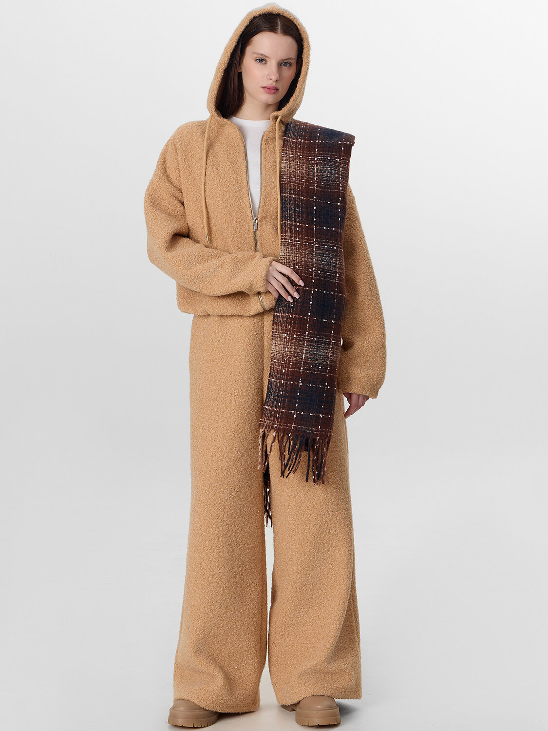 Универсальный бежевый цвет легко сочетается с любым верхом — от объемных свитеров до облегающих водолазок. Эти брюки станут идеальным выбором для домашнего отдыха, прогулок в прохладную погоду или создания актуального образа.