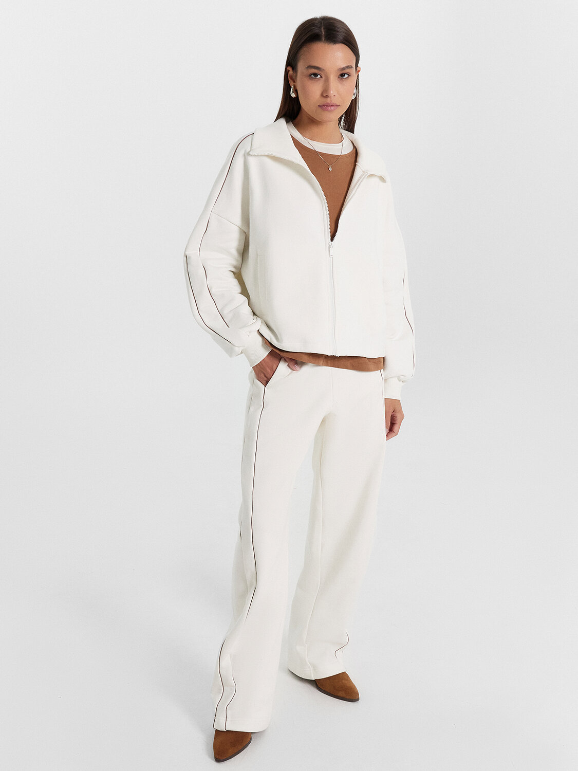 Брюки женские свободного силуэта из футера. Пояс цельнокроеный с эластичной тесьмой внутри. По поясу проложены отделочные строчки. В боковых швах отрезной лампас из футера с кантами из кулирки. Карманы в боковом шве, подкладка кармана из кулирки. Брюки скроены немного подковой. Брюки полной длины, по низу немного присобираются.