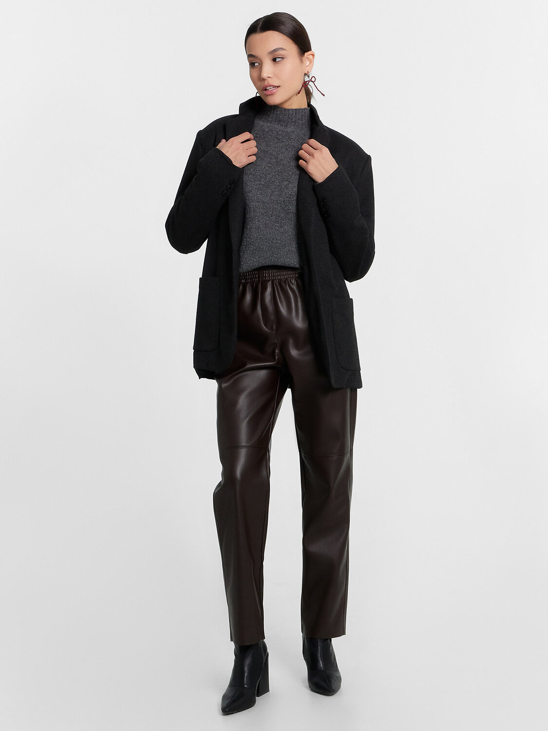 Брюки прямого силуэта зауженные к низу. Пояс цельнокроеный с эластичной тесьмой внутри (внутр. 40мм 40RV). В боковых швах обработаны карманы, подкладка карман из подкладочной ткани. На правой передней половинке проложена декоративная строчка - имитация гульфика. На передних и задних половинках горизонтальные подрезы выше колен. Нижние срезы брюк подкоеены.