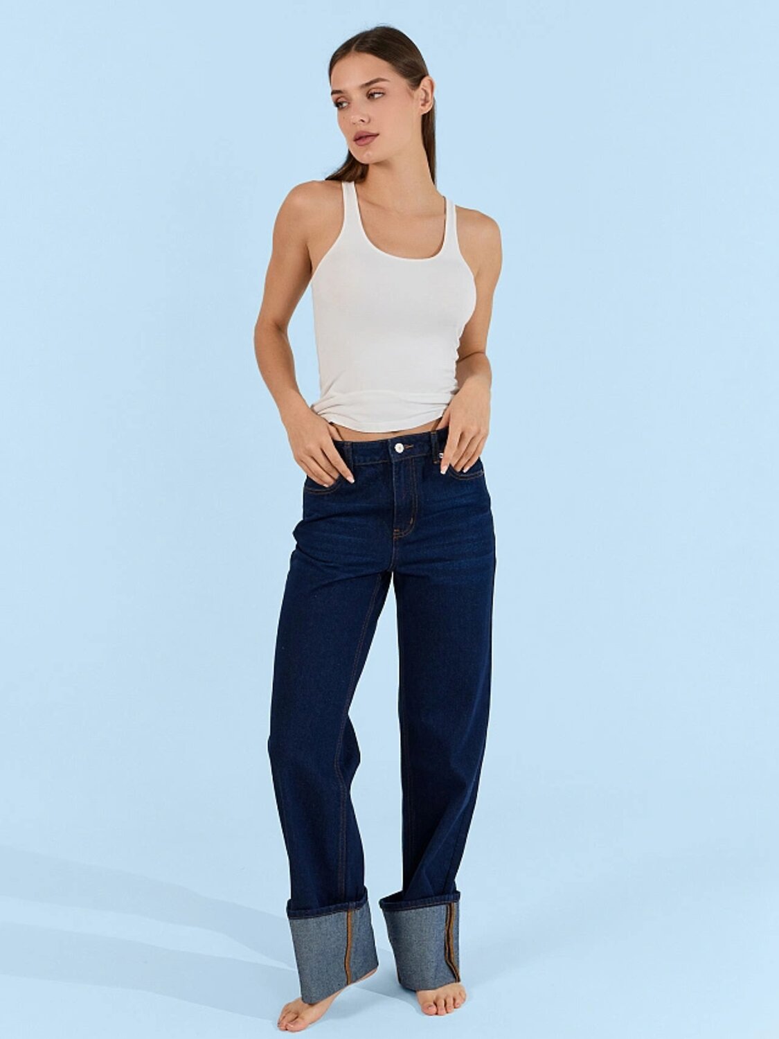 Эти джинсы станут основой гардероба — они сочетаются с рубашками, блузами, свитерами и пиджаками. Темно-синий оттенок подчеркивает элегантность и подходит для разных ситуаций: от деловых встреч до прогулок по городу. Модель обеспечивает уверенность и комфорт в любой обстановке.