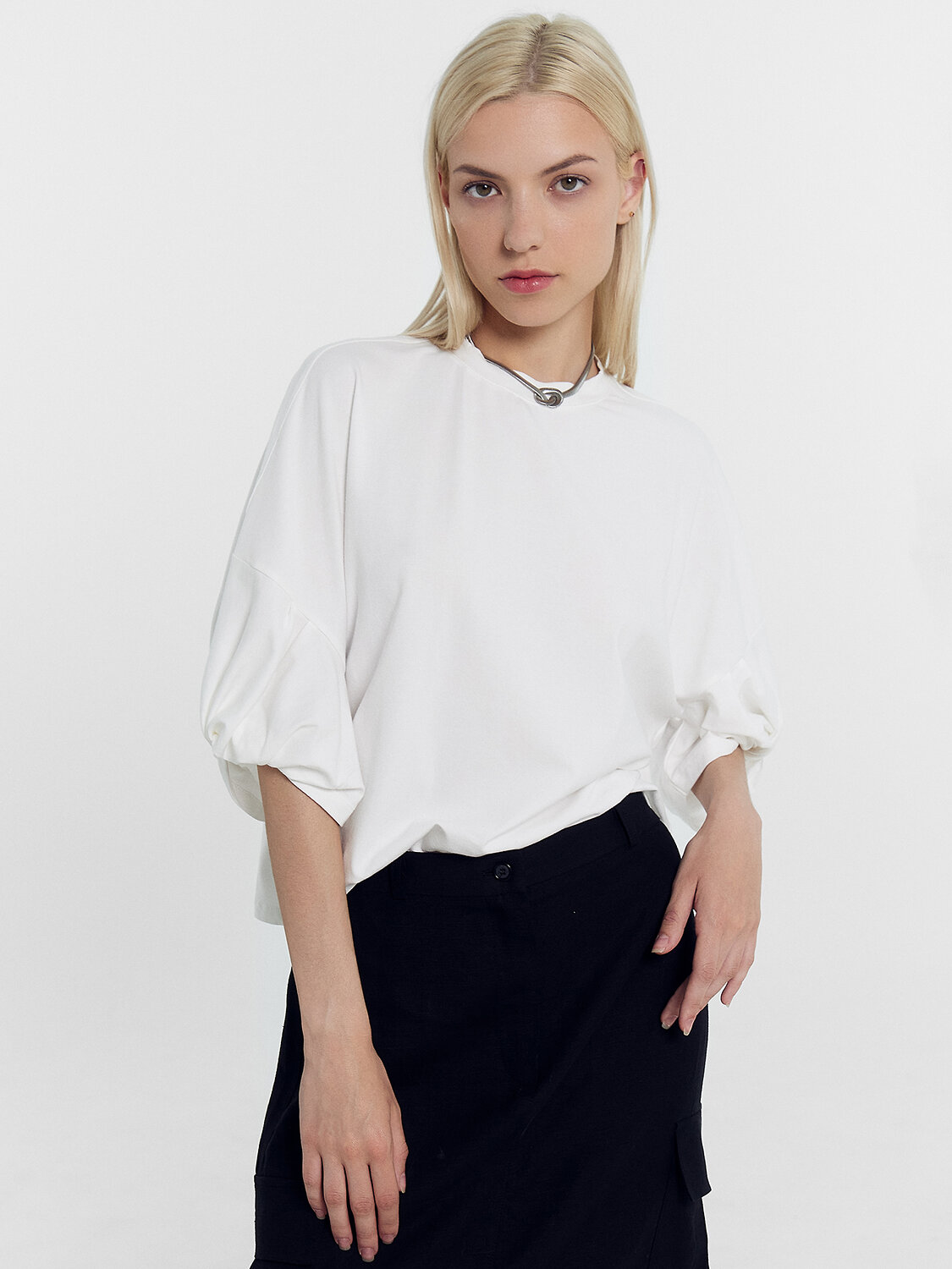 Рукав обьемный, со средним швом и перекрутом по низу.
