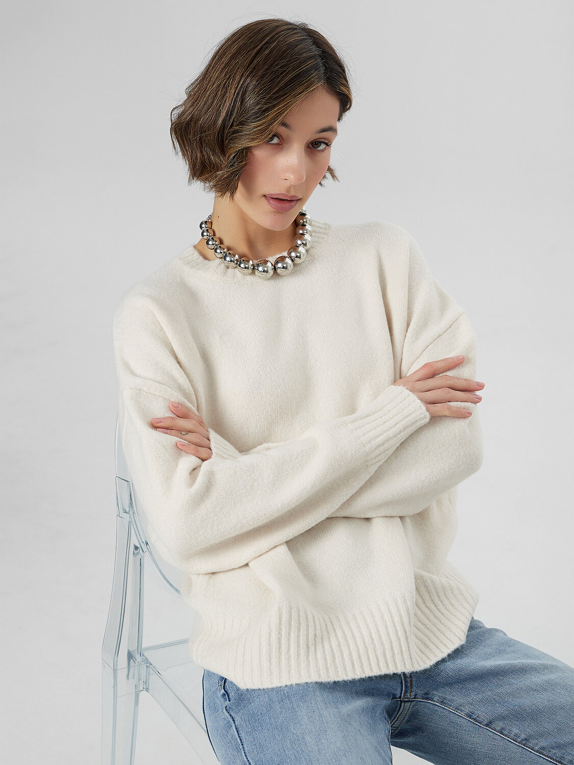 Благодаря сбалансированному составу, джемпер сохраняет форму, мягко облегает и не стесняет активность, а вязаная структура материала обеспечивает дополнительную воздушность и тепло. Эта модель станет универсальным решением для повседневной носки, городских прогулок или офисных будней, даря приятные ощущения и надежную защиту от легкого ветра и прохлады. Нежный молочный оттенок легко комбинируется с другими цветами в гардеробе, делая этот джемпер практичным и стильным выбором для межсезонья.
