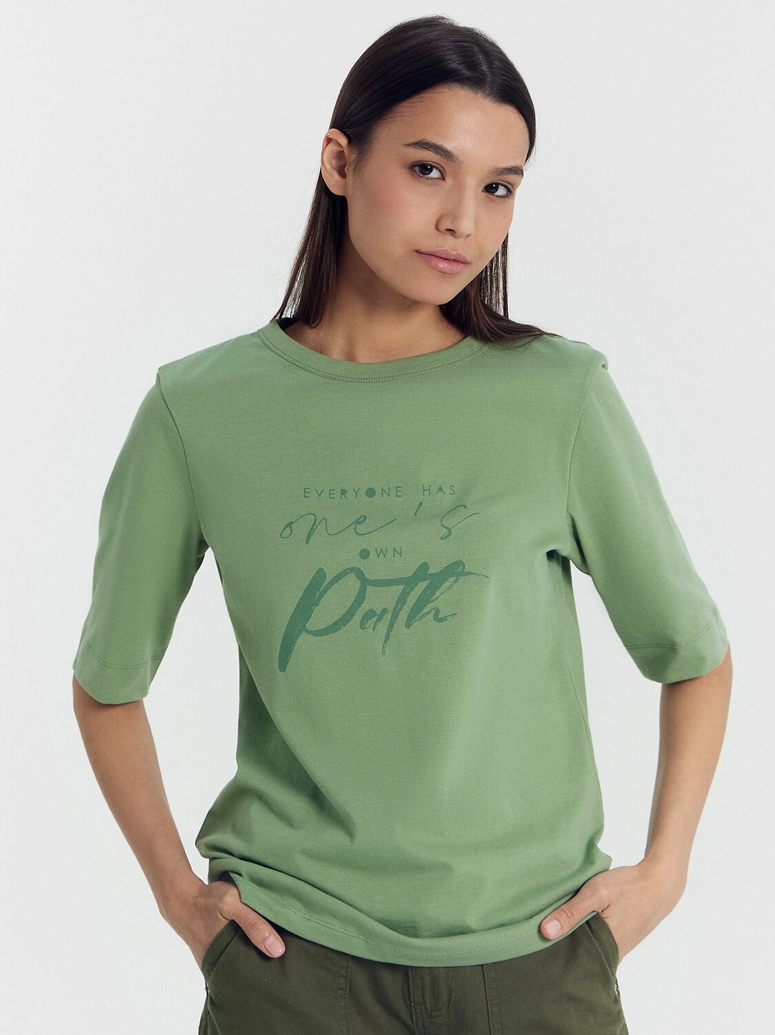 Футболка из трикотажного полотна кулирного переплетения. В составе ткани – только хлопок! Силуэт прямой, длина до середины бедер. Свободные рукава доходят до локтей. Вырез горловины круглый. Отличный выбор!