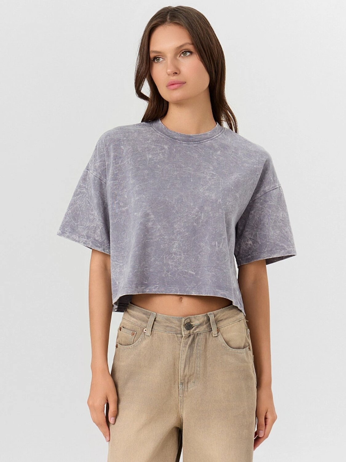 Укороченная хлопковая футболка из полотна кулирка. Силуэт свободный, оверсайз. Горловина круглой формы. Плечо спущено, пройма углублена – это делает движения максимально комфортными. Рукава длиной до локтя или чуть выше. Стильная модель!