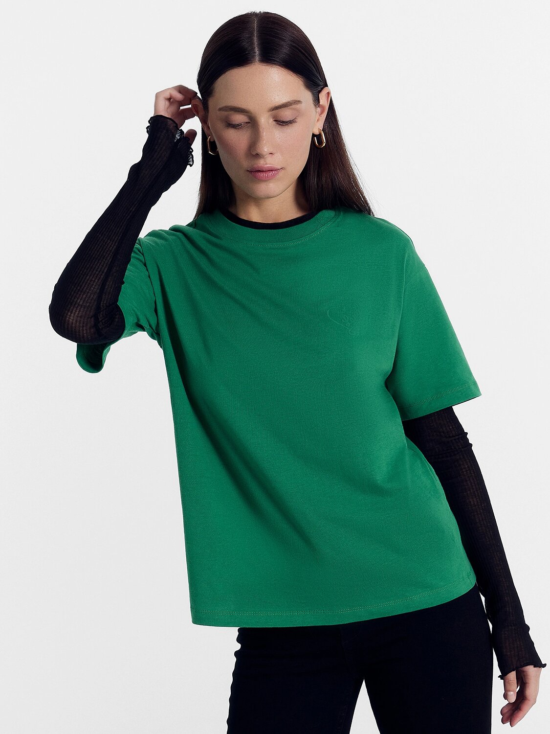 Хлопковая футболка свободного силуэта из трикотажной кулирки. Вырез круглой формы. Свободу движений гарантируют спущенная линия плеча и углубленная пройма. Рукава широкие, чуть выше локтя. Стильная модель!
