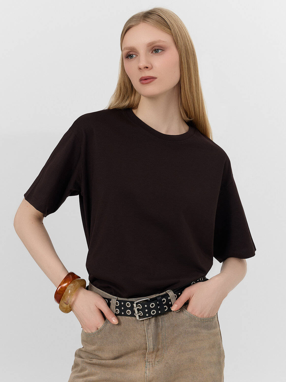 Хлопковая футболка свободного силуэта из трикотажной кулирки. Вырез круглой формы. Свободу движений гарантируют спущенная линия плеча и углубленная пройма. Рукава широкие, чуть выше локтя. Стильная модель!