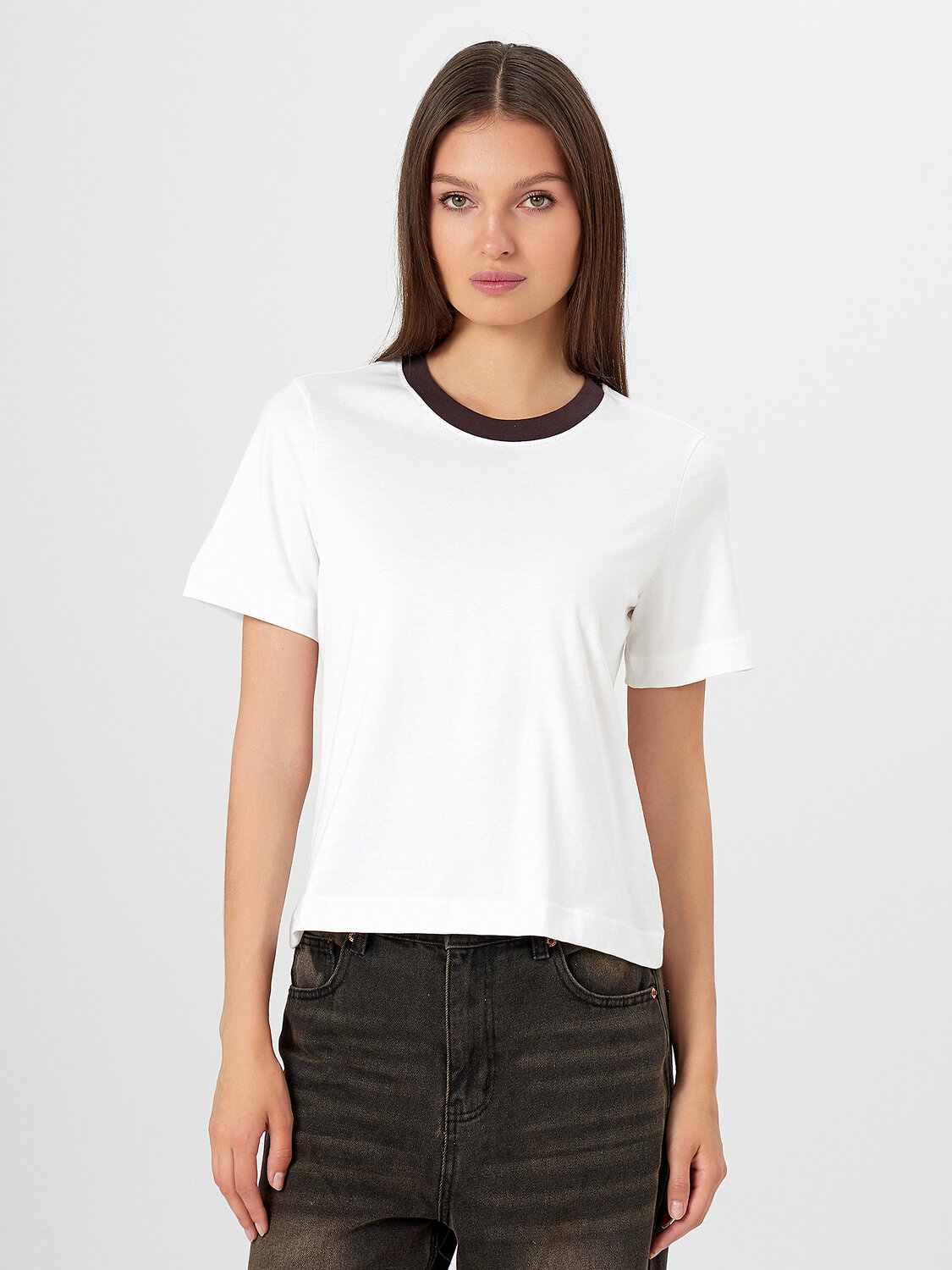 Базовая женская футболка прямого силуэта из трикотажной кулирки — это универсальная модель, которая легко впишется в повседневный гардероб. Слегка укороченная длина придает образу современность и делает футболку актуальной для сочетания с джинсами, брюками или юбками с завышенной талией. Круглая горловина оформлена широкой обтачкой из рибаны, что помогает сохранять форму и подчеркивает аккуратность исполнения. Широкие рукава добавляют расслабленности и комфорта, а широкие подгибки на рукавах и нижнем срезе подчеркивают качество пошива и делают изделие особенно долговечным. Трикотажная кулирка — мягкий, дышащий материал, приятный к телу и устойчивый к деформации, что делает футболку идеальной для ежедневной носки.