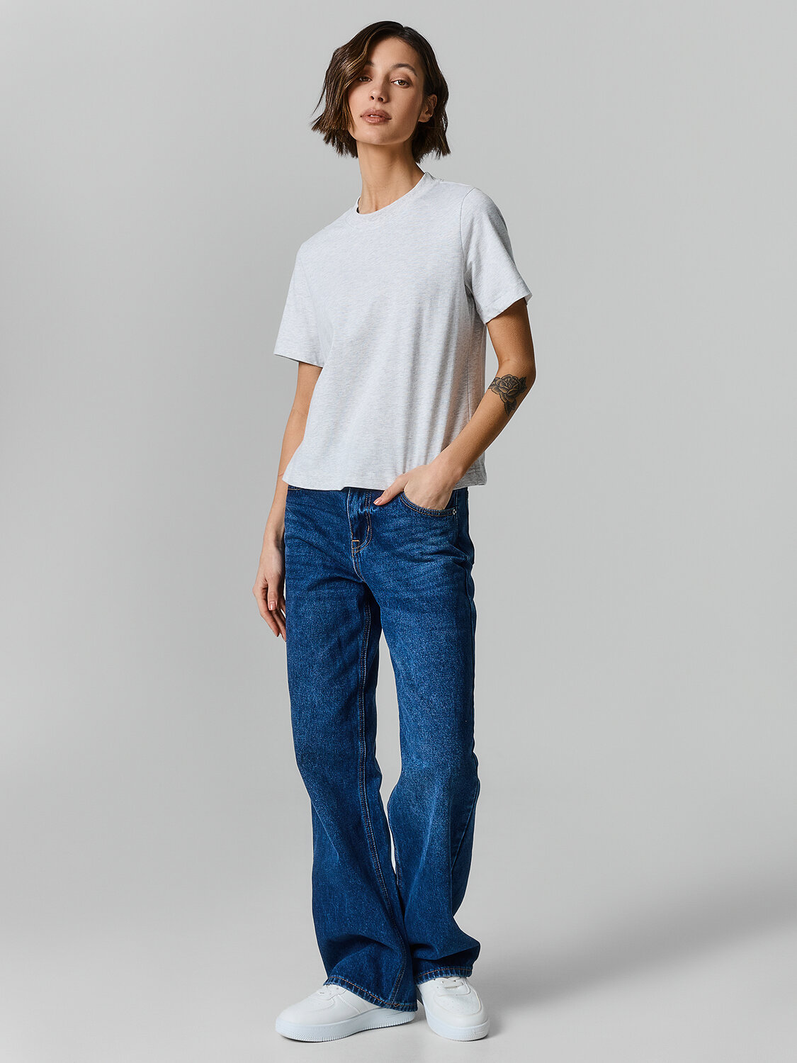 Базовая женская футболка прямого силуэта из трикотажной кулирки — это универсальная модель, которая легко впишется в повседневный гардероб. Слегка укороченная длина придает образу современность и делает футболку актуальной для сочетания с джинсами, брюками или юбками с завышенной талией. Круглая горловина оформлена широкой обтачкой из рибаны, что помогает сохранять форму и подчеркивает аккуратность исполнения. Широкие рукава добавляют расслабленности и комфорта, а широкие подгибки на рукавах и нижнем срезе подчеркивают качество пошива и делают изделие особенно долговечным. Трикотажная кулирка — мягкий, дышащий материал, приятный к телу и устойчивый к деформации, что делает футболку идеальной для ежедневной носки.