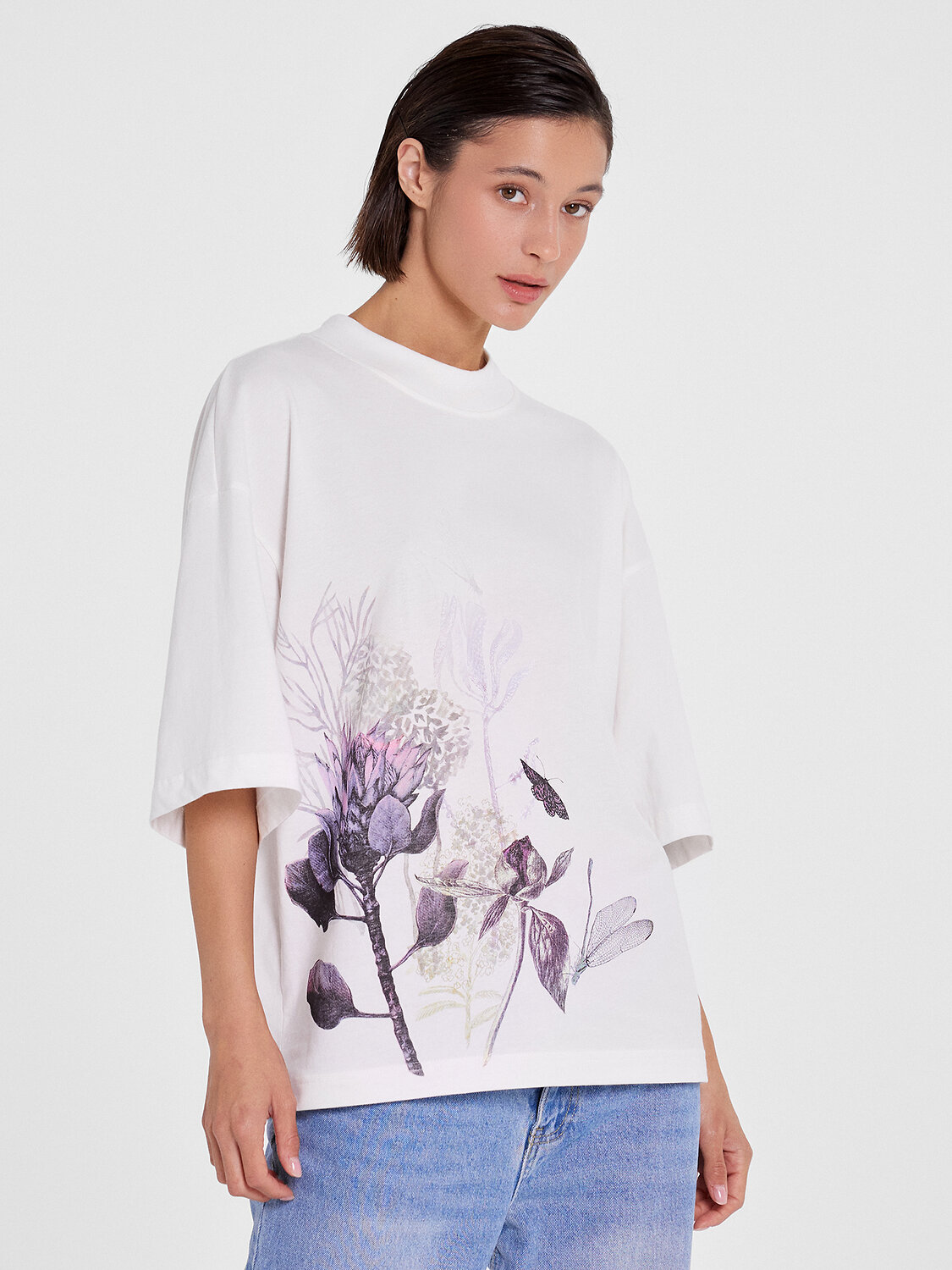 Футболка женская свободного силуэта из трикотажного кулирного пототна. Горловина круглой формы, с широкой обтачкой из рибаны. Плечо спущено, пройма углублена. Рукав втачной, длиной по локоть. Подгибка низа и рукавов широкая.
