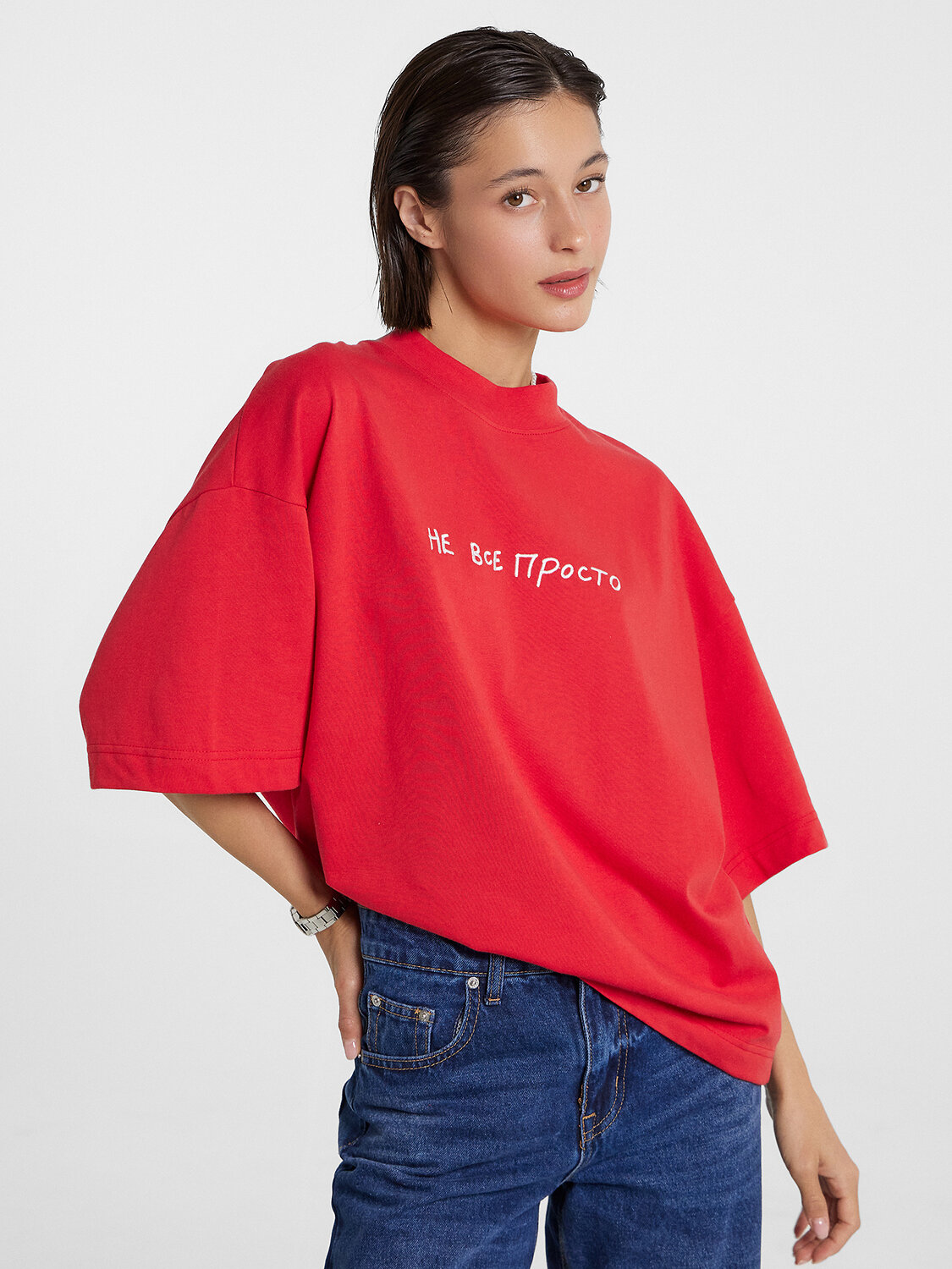 Футболка женская свободного силуэта из трикотажного кулирного пототна. Горловина круглой формы, с широкой обтачкой из рибаны. Плечо спущено, пройма углублена. Рукав втачной, длиной по локоть. Подгибка низа и рукавов широкая.