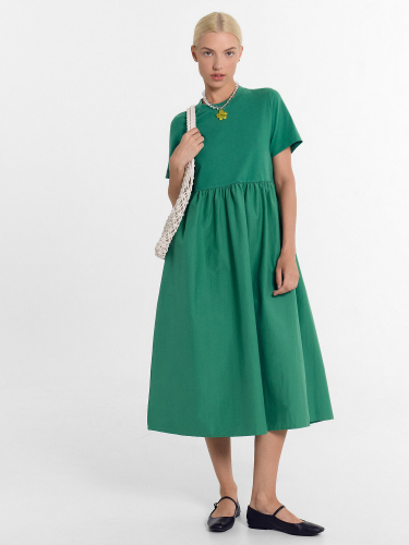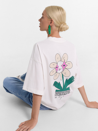 Футболка женская свободного силуэта из трикотажного кулирного пототна. Горловина круглой формы, с широкой обтачкой из рибаны. Плечо спущено, пройма углублена. Рукав втачной, длиной по локоть. Подгибка низа и рукавов широкая.
