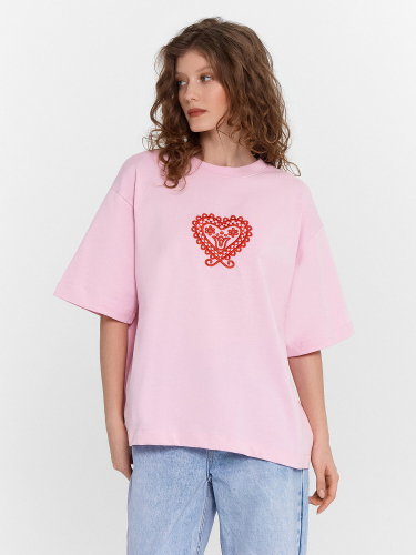 Футболка силуэта оверсайз из трикотажного полотна кулирка. Горловина круглой формы, обтачка горловины из рибаны. Шов горловины спинки закрыт бейкой из основного полотна.