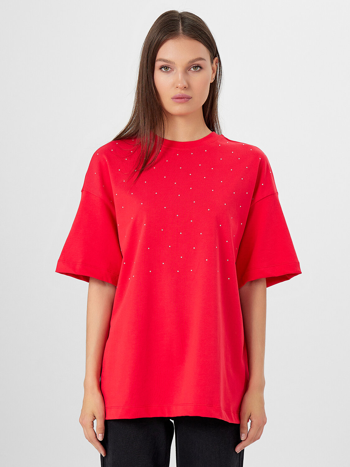 Эта женская футболка оверсайз со стразами станет ярким акцентом вашего гардероба. Выполненная из хлопковой кулирки, она сочетает в себе комфорт и стиль. Кулирка - это мягкий, прочный и воздухопроницаемый материал, отличающийся особой износостойкостью. Футболка имеет круглую горловину и спущенное плечо, а широкий рукав длиной чуть выше локтя добавляет модели стильный объем. Удлиненный силуэт делает эту модель идеальной для создания современных и удобных образов. Такой стильный и комфортный элемент одежды прекрасно подойдет для повседневной носки, добавляя блеска вашему образу. Рекомендуем!