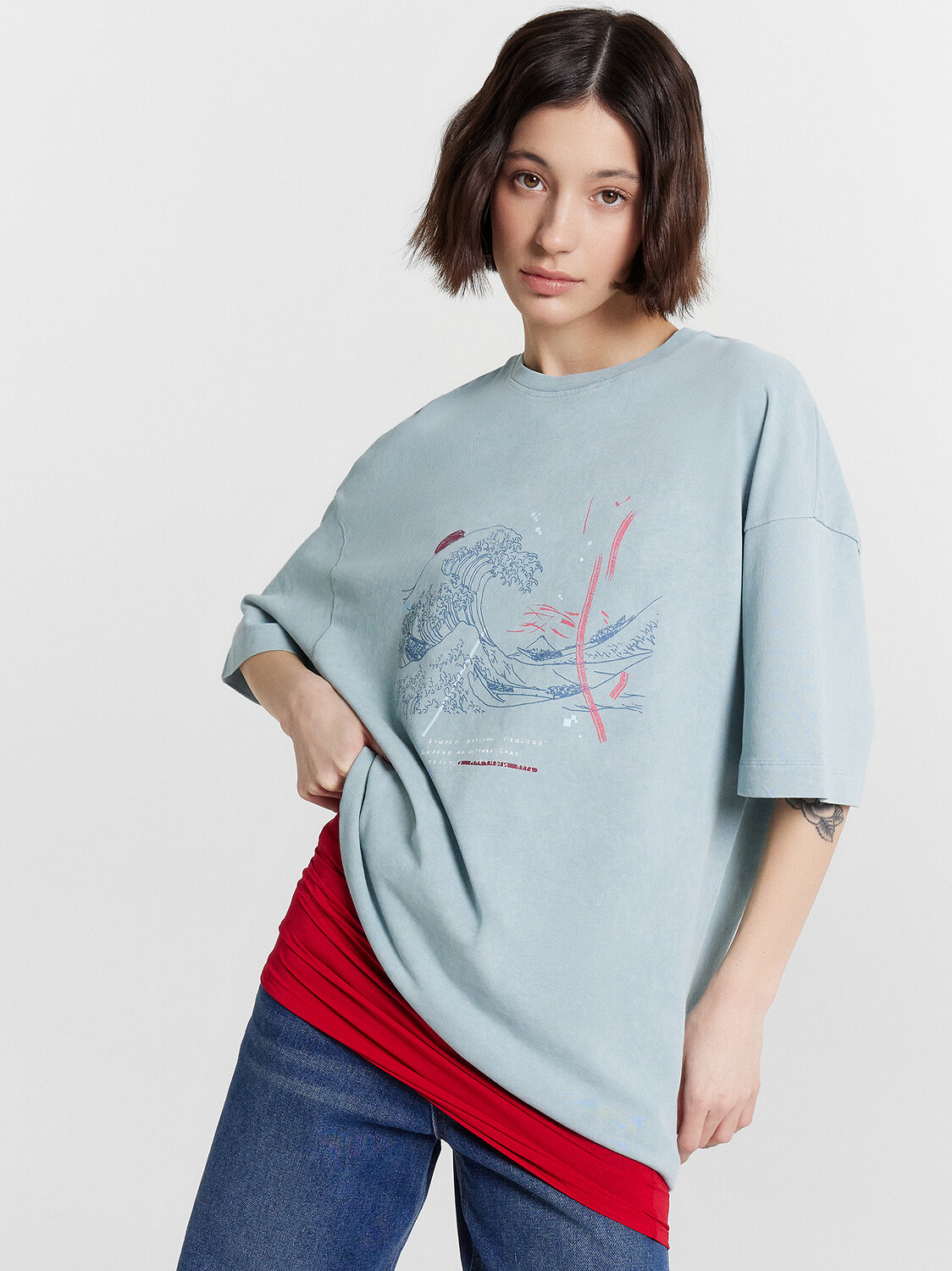 Удлиненная женская футболка оверсайз создана для тех, кто любит ощущать свободу движений, не жертвуя эстетикой. Модель, выполненная из хлопковой кулирки, приятно облегает кожу, дышит и сохраняет чувство свежести в течение всего дня. Круглая горловина с обтачкой из рибаны подчеркивает аккуратный дизайн и делает модель универсальной для любого случая. Спущенное плечо и углублённая пройма добавляют расслабленного шика, а широкие рукава длиной чуть выше локтя создают гармоничный баланс между элегантностью и комфортом. Эта футболка станет базовой вещью вашего гардероба, идеально дополняя как джинсы и кроссовки для повседневного городского стиля, так и леггинсы или шорты для домашнего уюта.Выбирайте эту модель и ощущайте гармонию комфорта и стиля каждый день!