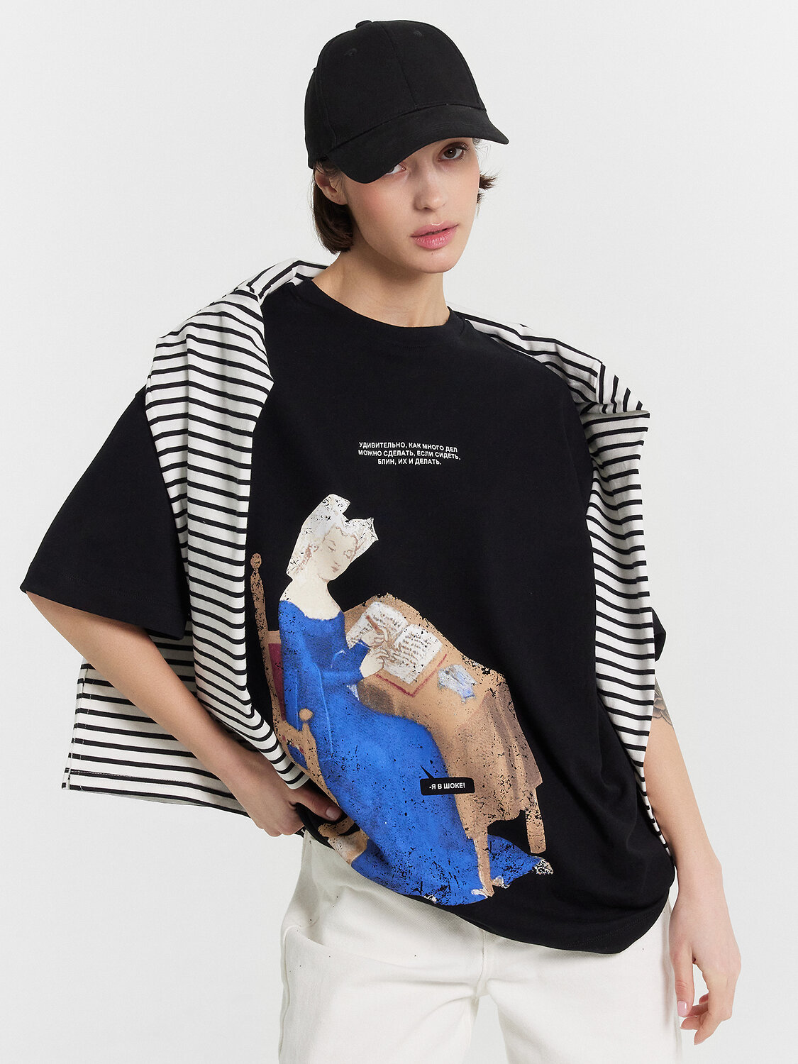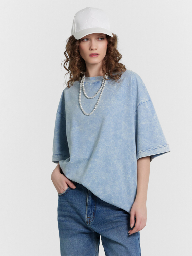Футболка силуэта оверсайз из трикотажного полотна кулирка. Горловина круглой формы, обтачка горловины из рибаны. Шов горловины спинки закрыт бейкой из основного полотна.