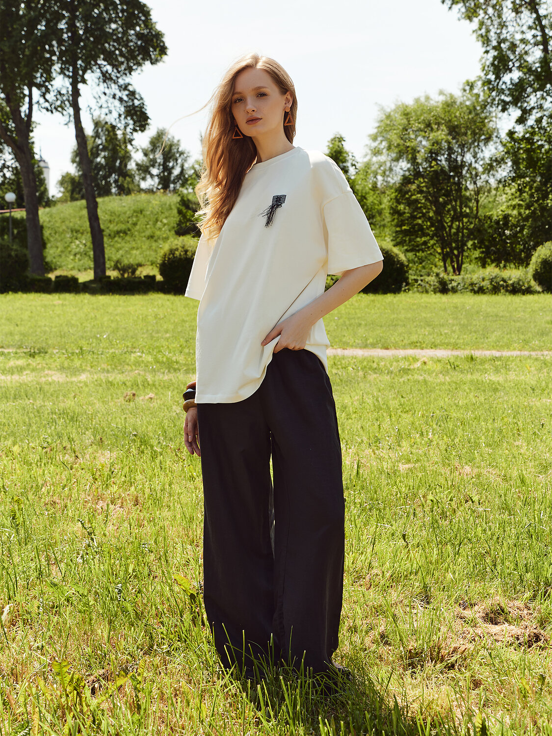Эта женская удлиненная футболка оверсайз — стильное и комфортное решение для современного гардероба. Свободный силуэт дарит ощущение расслабленности и удобства, подчеркивая актуальный тренд на объем и легкость в образе. Модель выполнена из хлопковой кулирки — мягкого, воздухопроницаемого материала, который приятно ощущается на коже и обеспечивает комфорт в течение всего дня. Круглая горловина оформлена обтачкой из рибаны, что придает дополнительную эластичность и делает посадку комфортной. Спущенная линия плеча и углубленная пройма добавляют непринужденности в образ, создавая актуальный и расслабленный акцент. Широкие рукава длиной чуть выше локтя обеспечивают свободу движений и гармонично дополняют силуэт, делая модель идеальной для повседневного стиля. Эта футболка прекрасно сочетается с легинсами, джинсами, спортивными брюками и шортами, позволяя создавать стильные и удобные образы для любого случая. Универсальная и комфортная — идеальный выбор для тех, кто ценит стиль, свободу и удобство в одежде!