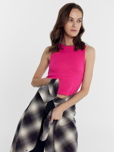 Горловина округлой формы обработана обтачкой из рибаны. Шов втачивания обтачки по спинке закрыт тесьмой хб 10мм.Рукава втачные, корткие. Линия плеча спущена.