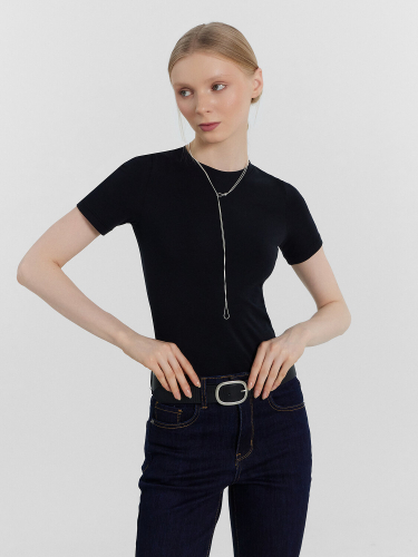 Футболка прилегающего силуэта. Горловина круглой формы обработана обтачкой из основного полотна. Рукава втачные, короткие. Нижние срезы футболки и рукавов обработаны швом вподгибку.