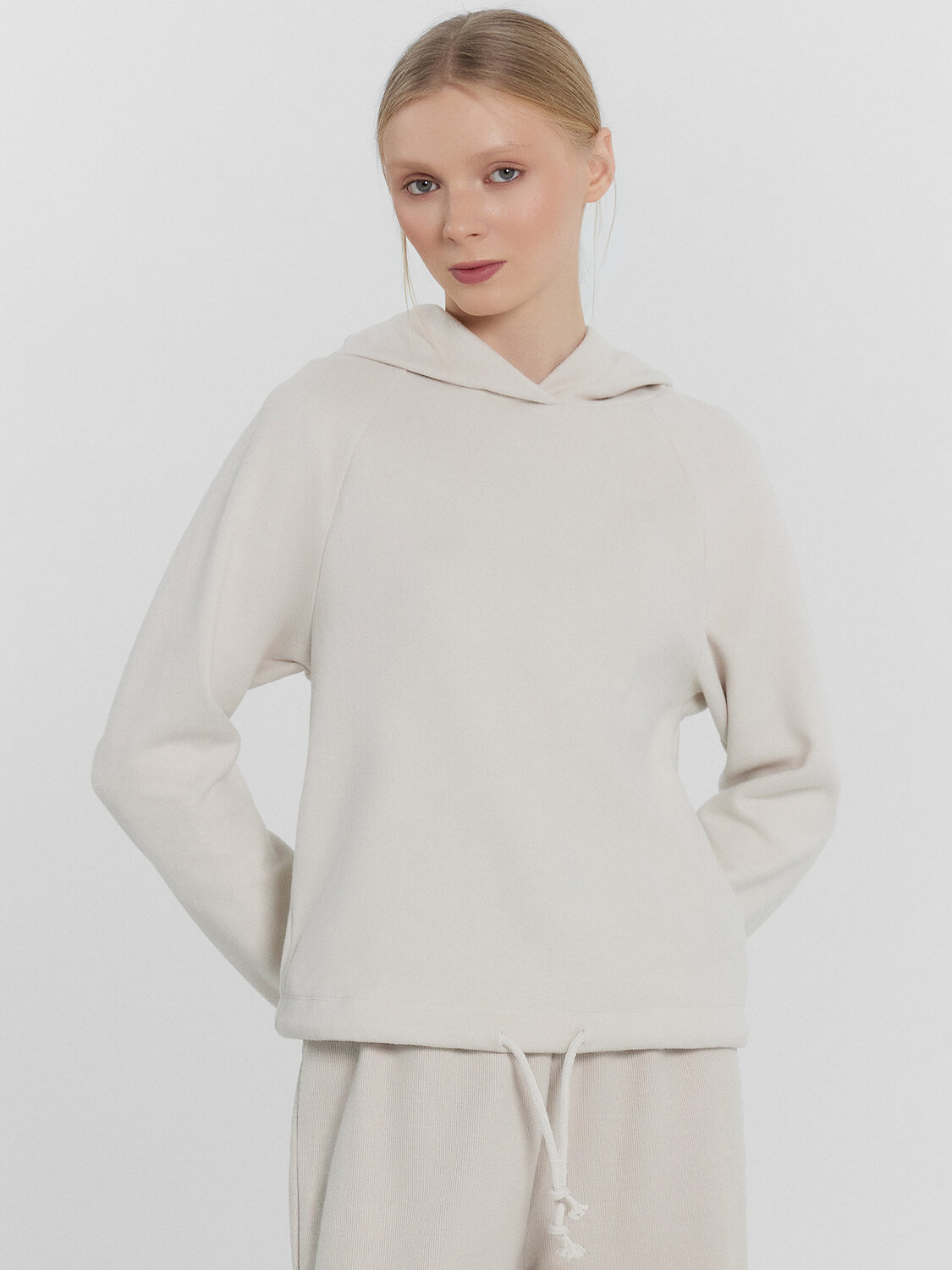 Анорак свободного силуэта. Горловина круглой формы с капюшоном. Рукава реглан свободные, низ рукавов обработан швом в подгибку. Низ анорака обработан швом в подгибку, по центру пробиты петли и втянут шнур.