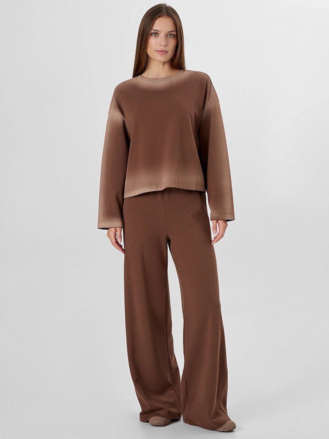 Набор состоит из свободного укороченного свитшота и прямых брюк, выполненных из мягкого трикотажа. Свитшот с круглой горловиной и длинными широкими рукавами легко сочетается с любым низом, а укороченный крой позволяет создавать модные многослойные образы.