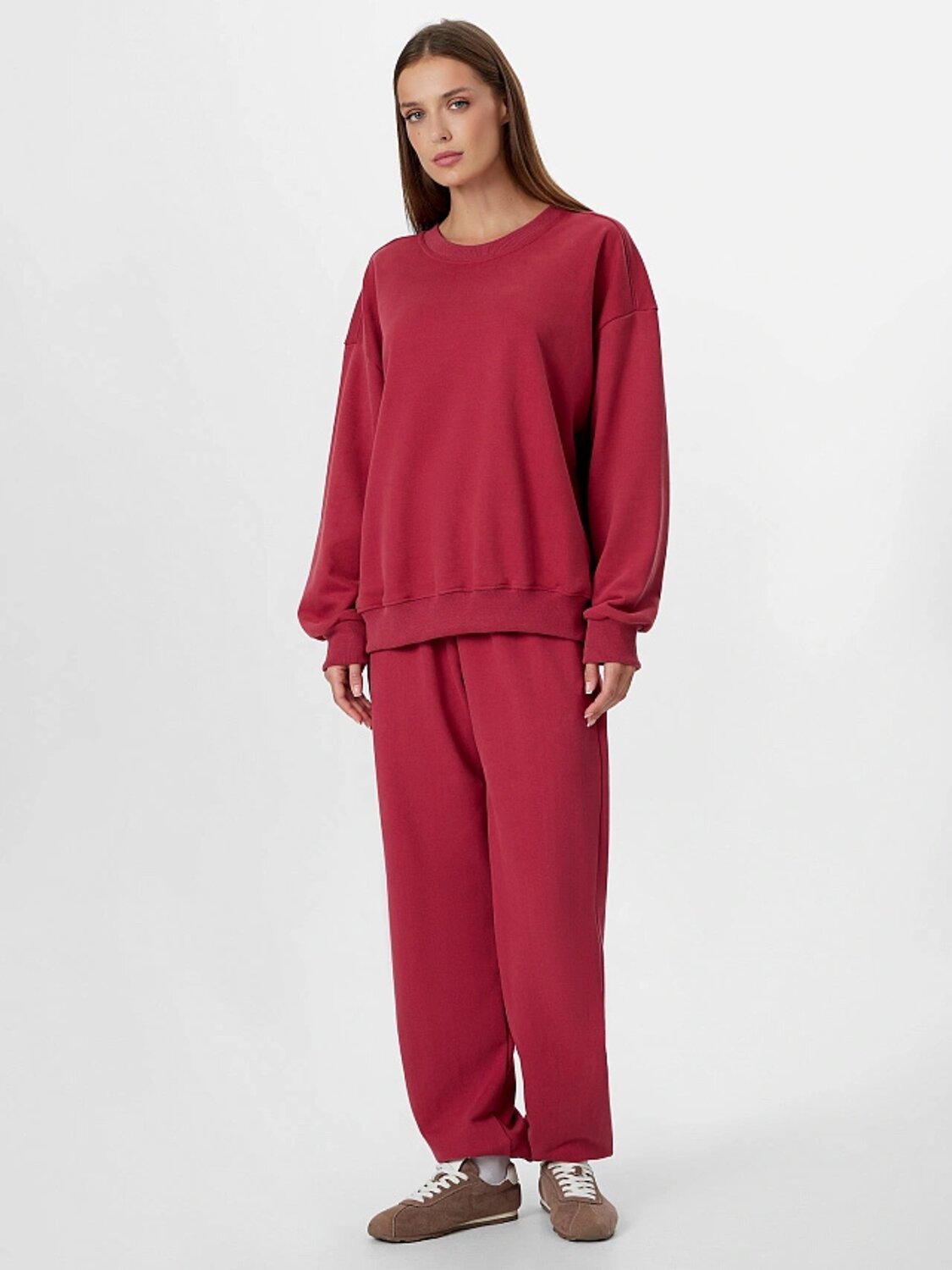 Женский спортивный костюм от Mark Formelle станет удачным вложением в ваш базовый гардероб. Свитшот свободного силуэта с круглой горловиной и длинными рукавами с эластичными манжетами из рибаны обеспечивает свободу движений и уют. А спущенная линия плеча добавляет современный акцент в дизайн. Прямые свободные брюки с эластичным поясом на кулиске гарантируют удобную посадку и практичность, а карманы в боковых швах предоставляют дополнительное удобство. Изделие выполнено из футера с подчесом, что делает костюм теплым и приятным к телу. Этот костюм станет отличным выбором для тех, кто ценит комфорт и стиль в повседневной жизни.
