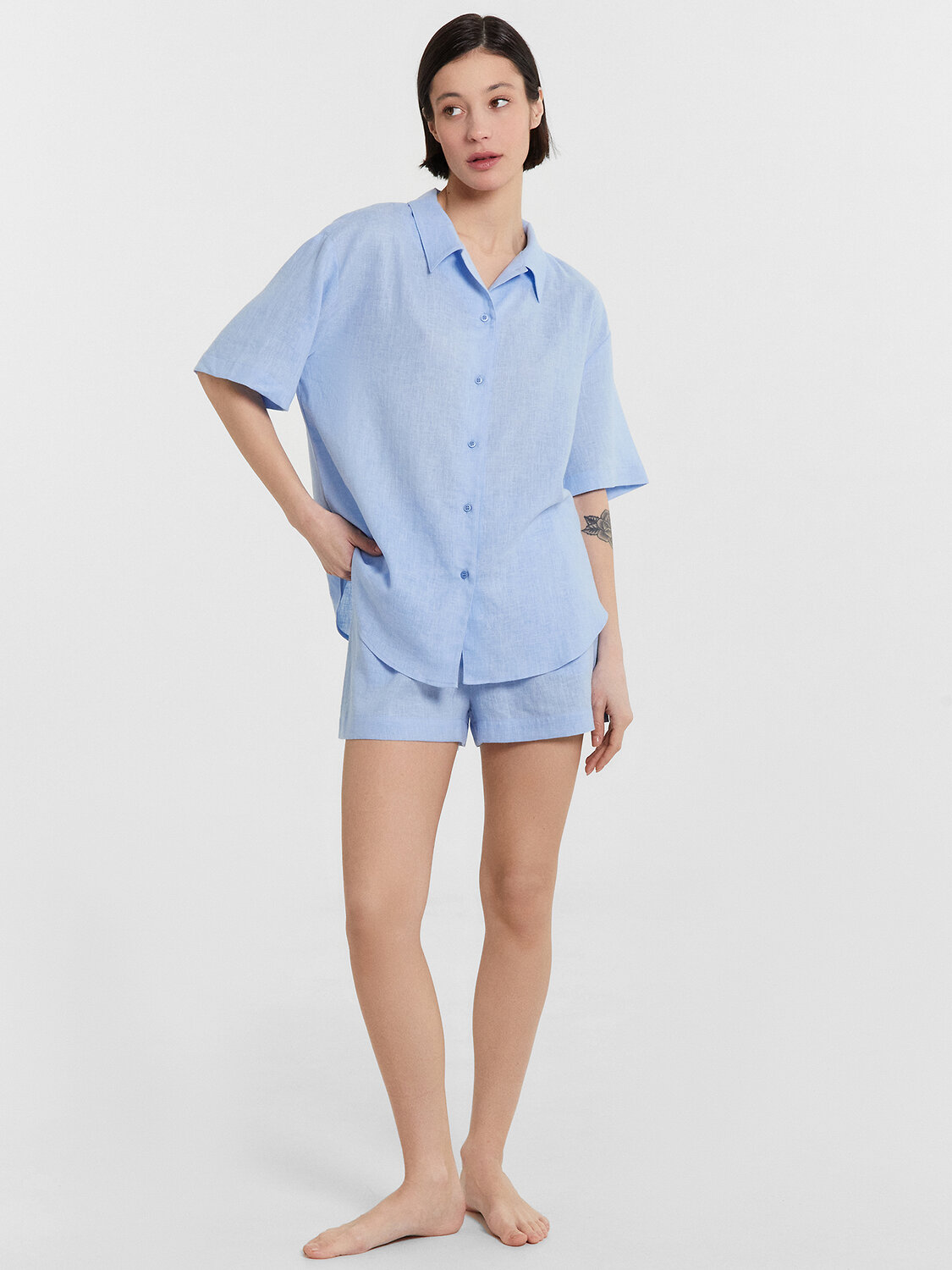 Женская пижама, выполненная из сочетания льна и вискозы. Она сочетает в себе стиль и комфорт, идеально подходя для повседневного ношения дома. Рубашка свободного силуэта с отложным воротником и короткими рукавами имеет центральную застежку на пуговицах, что обеспечивает удобство и легкость в носке. Шорты свободного кроя с высокой посадкой и карманами в боковых швах добавляют практичности и комфорта. Модель выполнена из натурального льна и вискозы. Такое сочетание материалов обеспечивает оптимальный комфорт и долговечность. Лён - это натуральный материал, который обладает отличными дышащими свойствами и дарит прохладу в жаркие дни. Вискоза, в свою очередь, добавляет мягкости и шелковистости, делая изделие особенно приятным к телу. Эта пижама станет вашим любимым выбором для уютных вечеров и расслабленного отдыха дома.