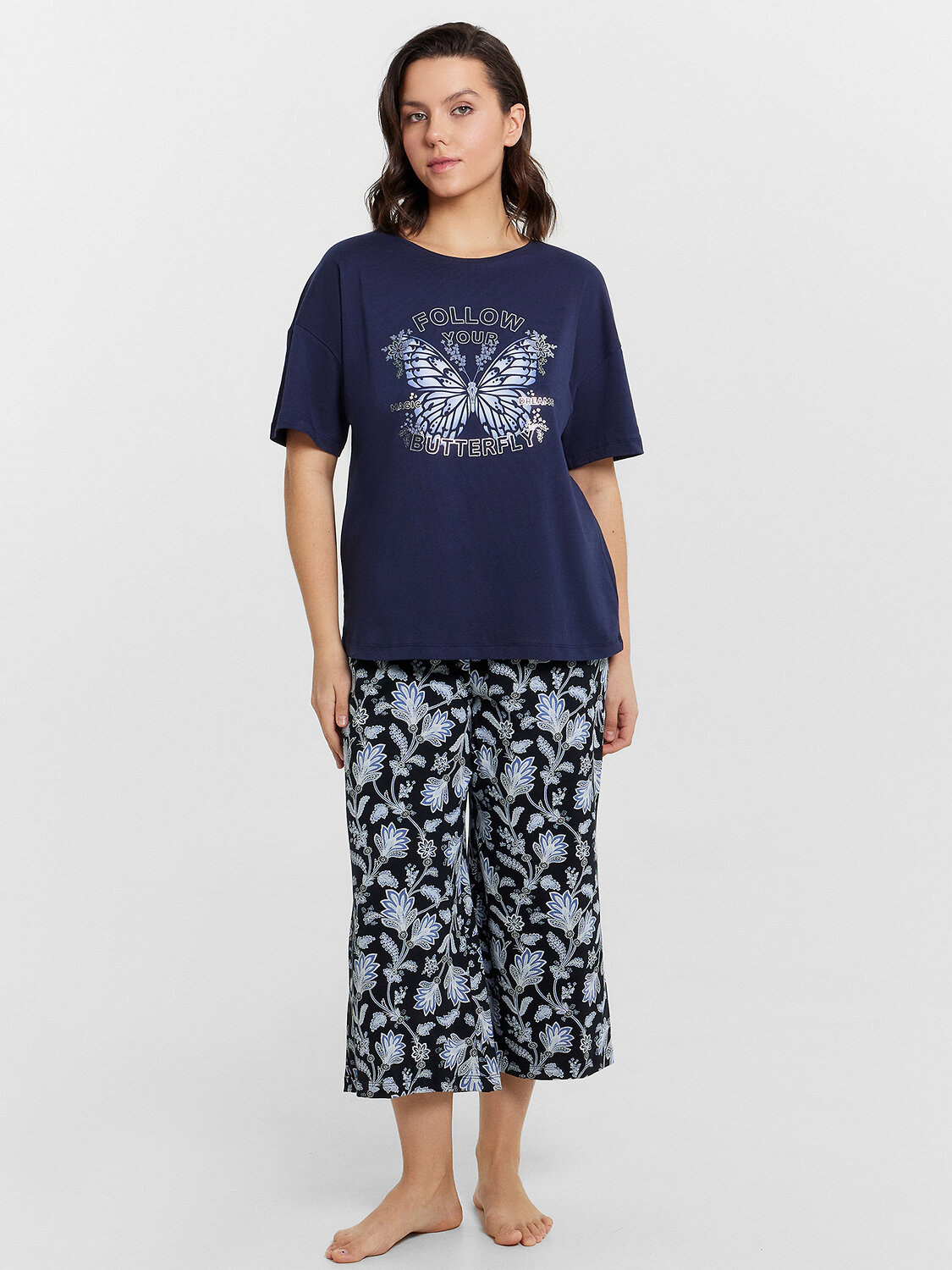 Женская пижама Mark Formelle станет идеальным дополнением вашего домашнего гардероба. Свободная футболка с круглой горловиной и короткими рукавами со спущенной линией плеча обеспечивает максимальный комфорт и свободу движений. Бриджи свободного кроя с эластичным поясом идеально сидят на талии, не стесняя движений и обеспечивая удобство на протяжении всего дня. Изделие выполнено из нежной кулирки - мягкого и приятного к телу материала, который отличается дышащими свойствами и гипоаллергенностью. Подарите себе или своим близким эту чудесную пижаму и наслаждайтесь уютными домашними вечерами.