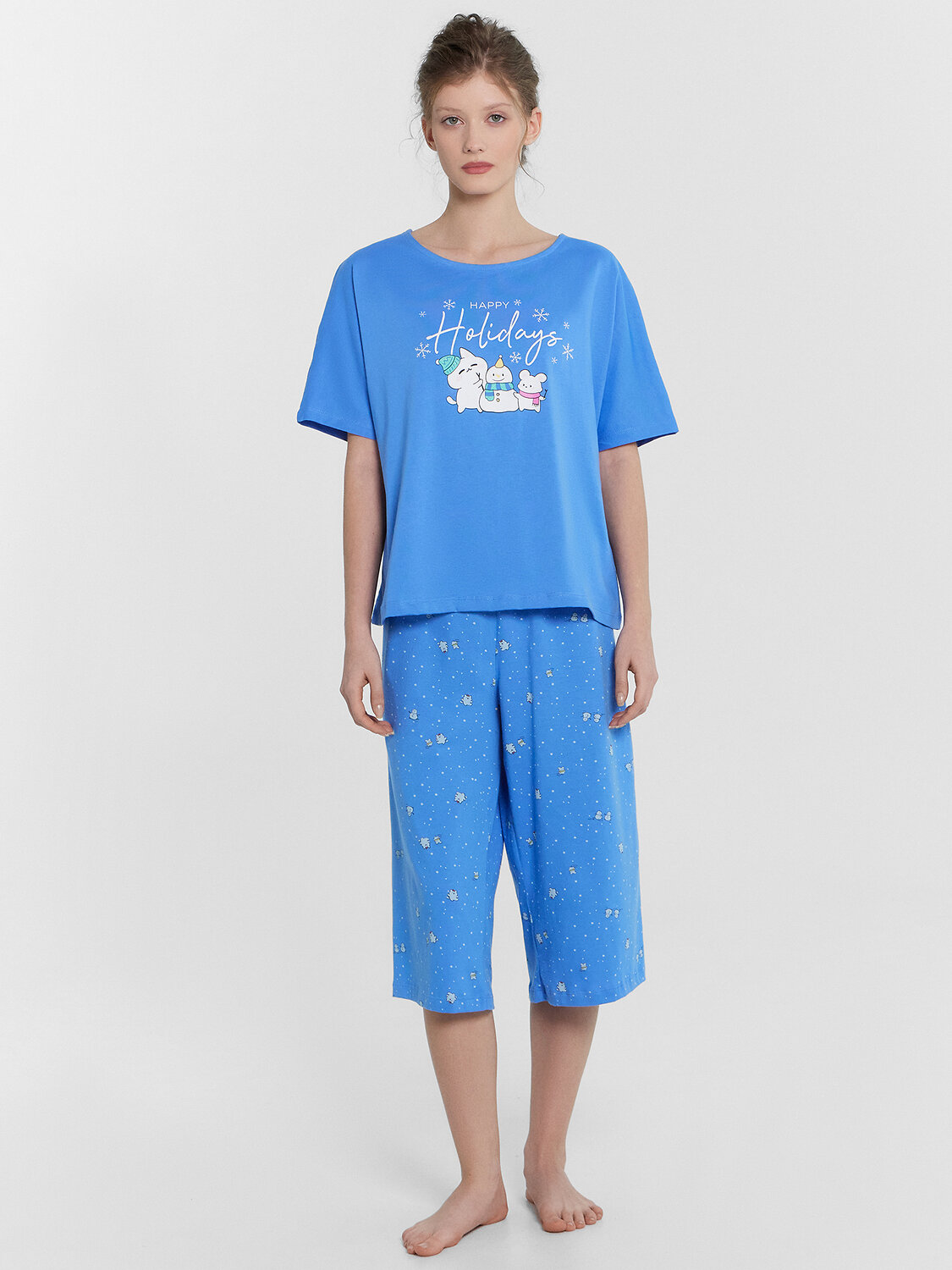 Пижама женская для ваших комфортных домашних образов - идеальный выбор для уютных вечеров и расслабленного отдыха. Комплект состоит из футболки и бриджей. Джемпер свободного силуэта с круглой горловиной и рукавами длиной выше локтя обеспечивает максимальный комфорт и свободу движений. Бриджи с комфортной посадкой на талии прямого кроя дополняют комплект, создавая гармоничный и стильный образ. Изделие выполнено из нежной кулирки - материала, который отличается особой мягкостью, воздухопроницаемостью и прочностью. Кулирка прекрасно впитывает влагу и быстро сохнет, обеспечивая комфорт в течение всего дня. Эта пижама станет вашим любимым вариантом для домашних образов, сочетающим в себе удобство и элегантность. Рекомендуем!