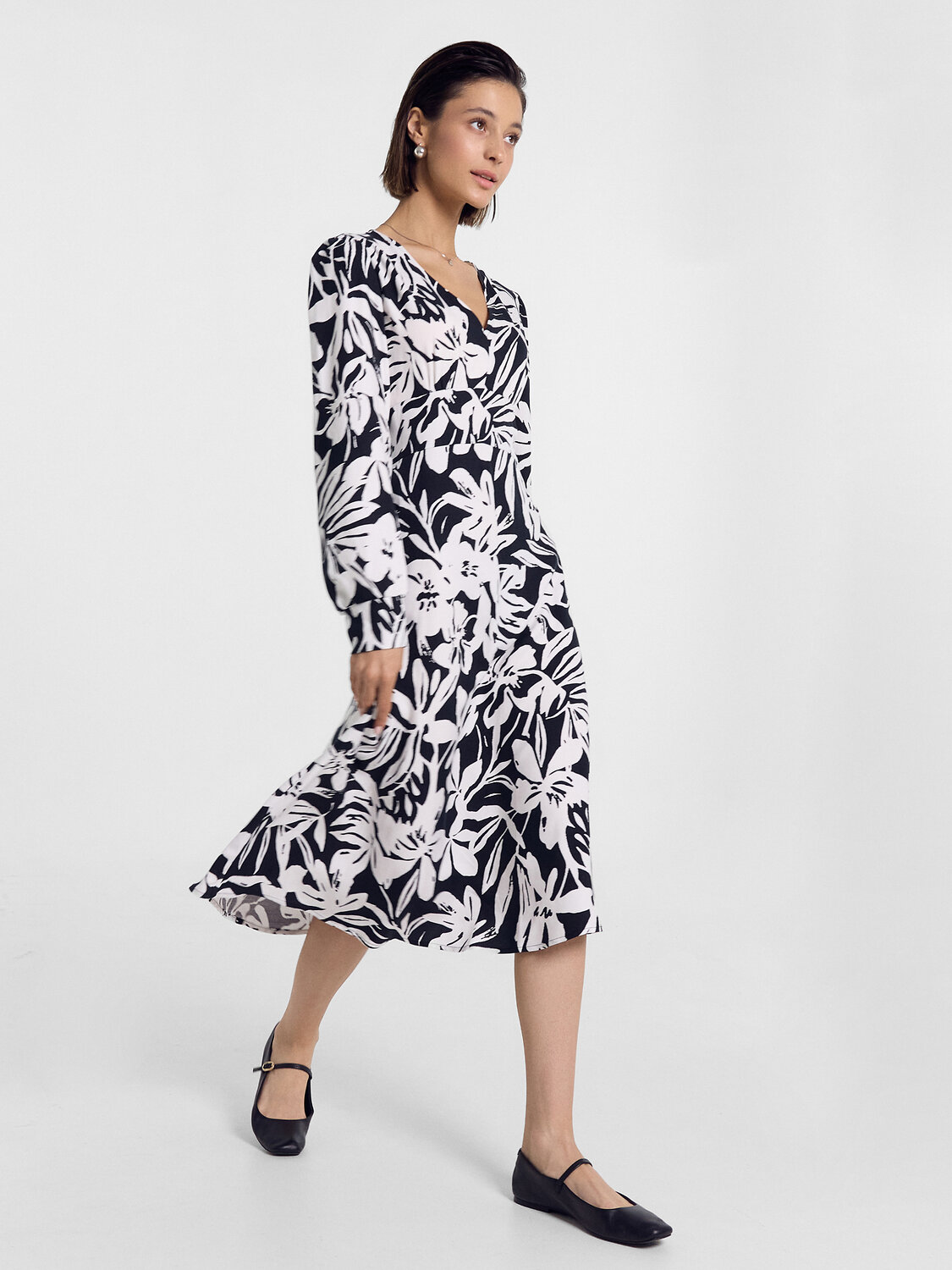 Женское платье полуприлегающего силуэта из нежной и легкой вискозы. Модель акцентирует внимание на талии. Вырез V-образный, с отрезным лифом и сборками по поясу. Рукава длинные, с манжетами и сборками. Длина модели ниже колена, силуэт к низу расширяется. Стильно!