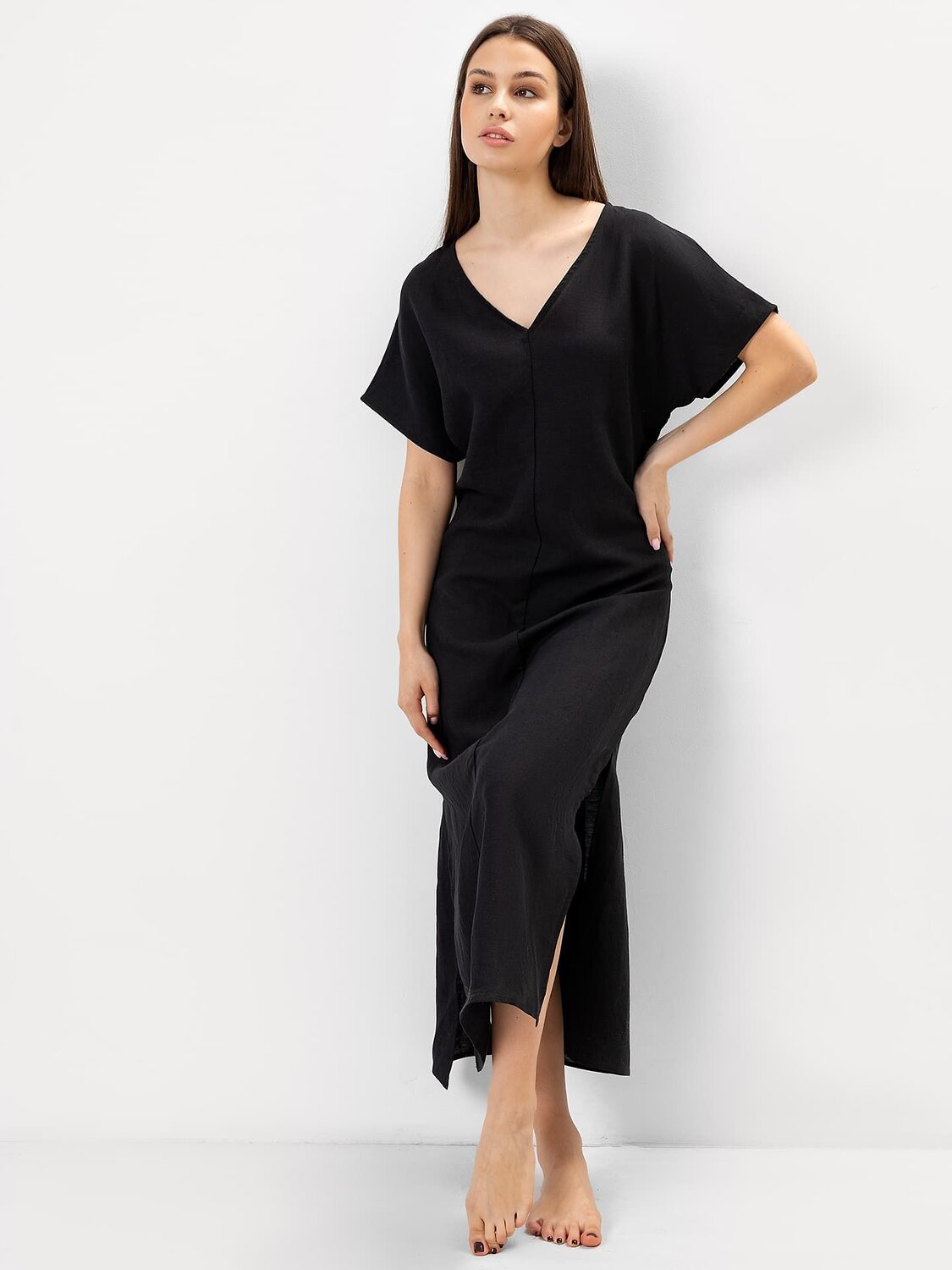 Платье прямого силуэта, длина макси. По переду и спинке средний шов. Горловина V-образной формы. Вырез горловины обработан в чистый край. Рукава цельнокроеные, обработаны в чистый край. По боковым швам разрезы. Низ платья обработан швом в подгибку.