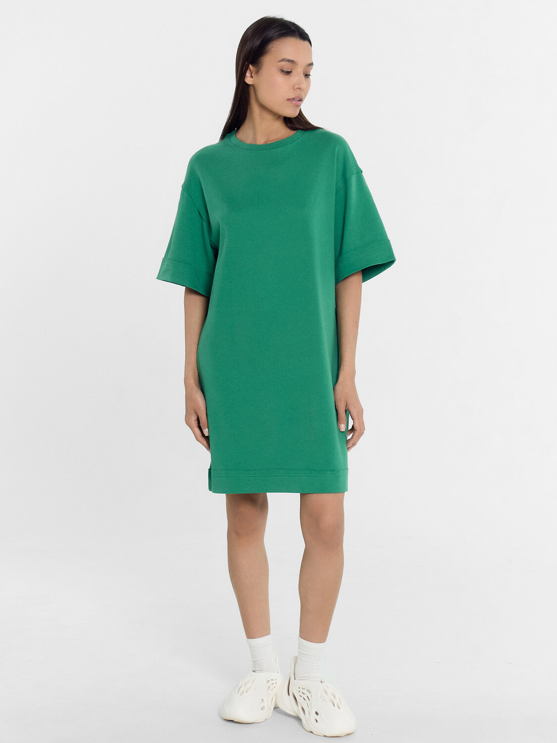 Платье свободного силуэта из трикотажного полотна интерлок/ Горловина круглой формы. Обтачка горловины из основного полотна.