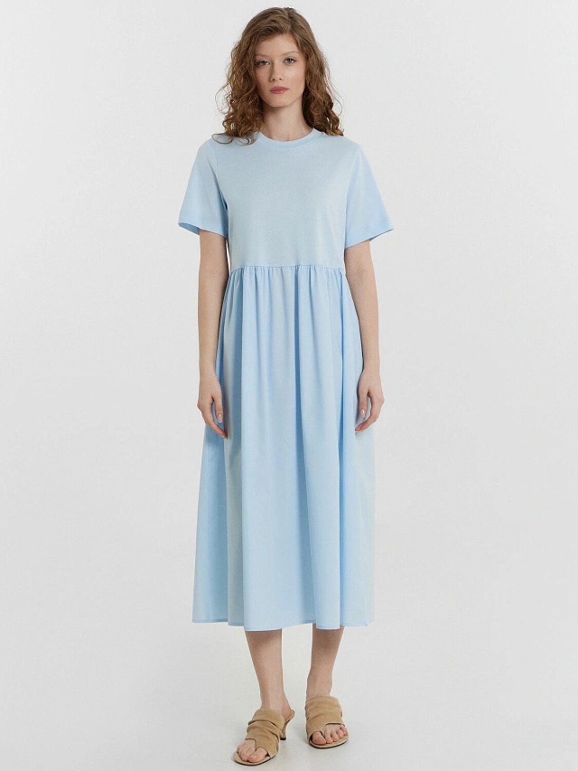 Женское платье свободного силуэта — элегантный и удобный вариант для повседневного гардероба, сочетающий комфорт, стиль и универсальность. Изделие выполнено из натурального хлопка, который отличается мягкостью, воздухопроницаемостью и приятными тактильными ощущениями. Хлопок позволяет коже дышать, создавая ощущение легкости и комфорта даже в жаркую погоду. Круглая горловина с обтачкой из рибаны обеспечивает аккуратную посадку, добавляя эластичности и удобства при носке. Слегка спущенное плечо и углубленная пройма придают расслабленный стиль, делая платье подходящим для повседневного образа. Короткие рукава добавляют легкость и делают модель идеальной для летнего сезона, обеспечивая свободу движений и комфорт. Отрезной крой по талии подчеркивает силуэт, а присборенный и расширяющийся к низу фасон создает легкость, женственность и элегантность в образе. Длина миди делает платье универсальным, подходящим как для прогулок, так и для более нарядных случаев. Прекрасный выбор для тех, кто ценит удобство, натуральные ткани и стильные детали!